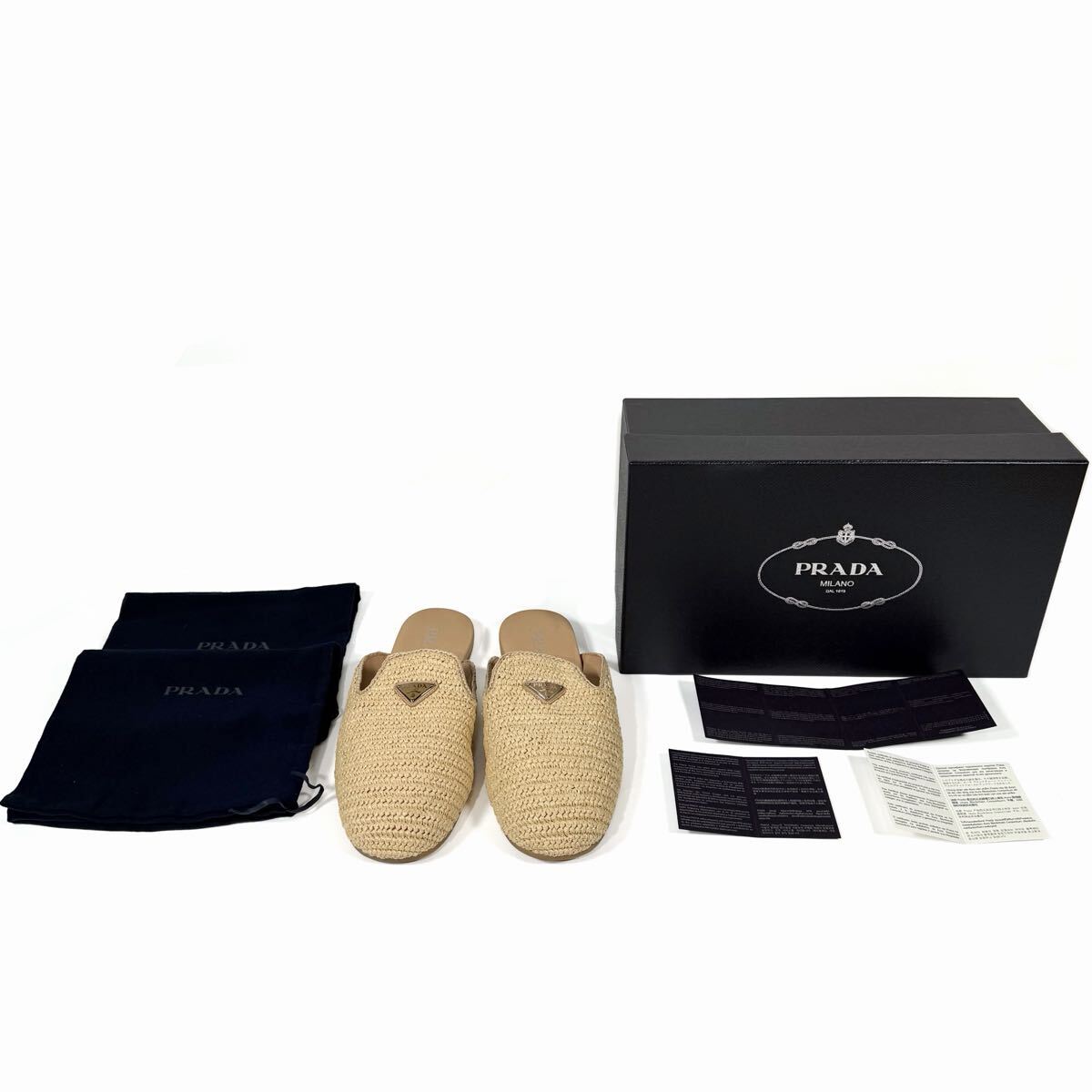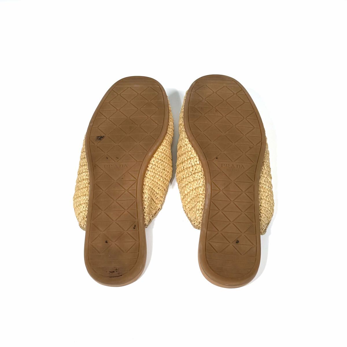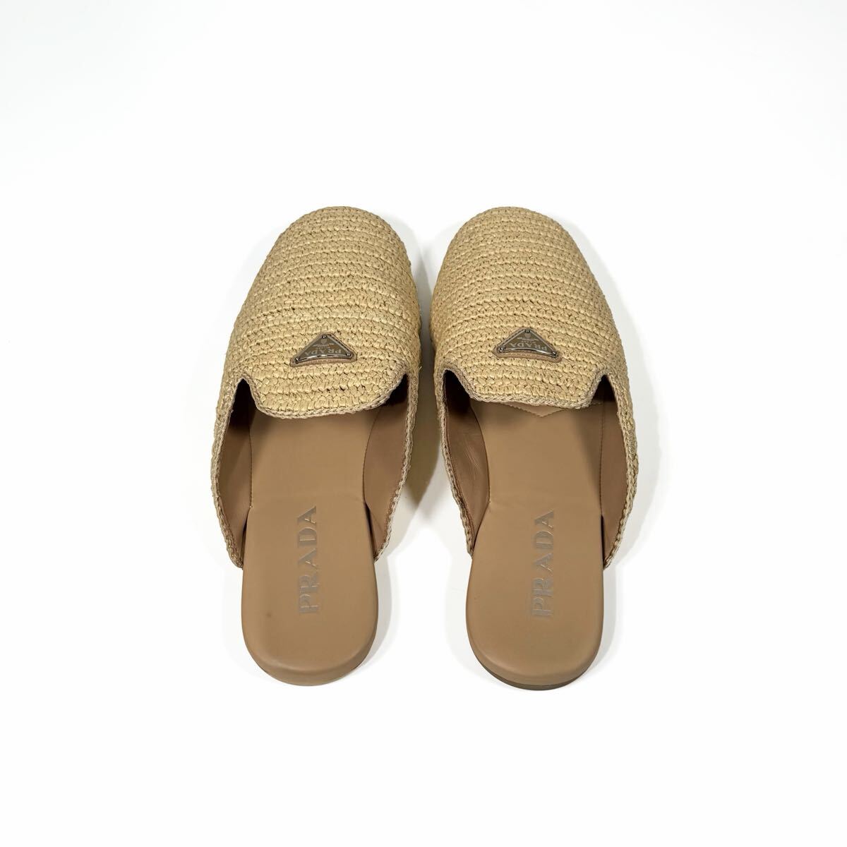 夏らしい軽やかな印象のクロシェ(かぎ編み)デザインが特徴的なミュールです。ナチュラルなラフィア素材が上品でリラックス感のある雰囲気を演出。甲部分にはブランドの象徴でもあるエナメルメタルのトライアングルロゴがあしらわれ、高級感があります。