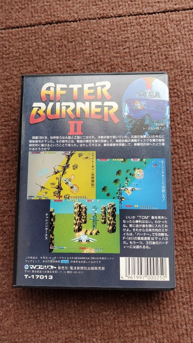 SEGA メガドライブ版 アフターバーナーⅡ です。部屋を整理していた所出てきました。年代物ですが割とキレイな方だと思います。一応初期動作確認はできました。付属している物は画像にある物だけです。(モニター等は含みません)古い物ですので画像をよく確認しノークレーム、ノーリターン、ノーキャンセルでお願いします。神経質な方はご遠慮ください。発送に関してはゆうパック着払いになります。