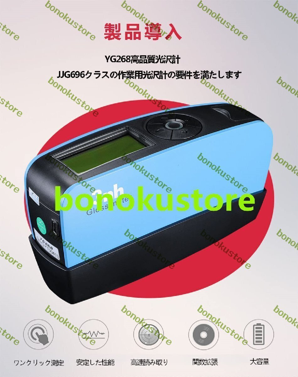 ?製品説明:YG268光沢計は、表面光沢測定・管理用の20°/60°/85° 3つの角度プロ光沢計のモデルで、プラスチック、金属、塗料・コーティング、家具、木材、インクなど、あらゆる産業に幅広く適用できます。 印刷および包装、化粧品、布地、繊維および衣服、電子機器、タイルおよび装飾産業。YG268は高品質プロの高精度光沢計であり、市場の98%以上の業界に適しています。?製品の特徴:1.美学と人間工学を組み合わせたエレガントなデザイン。2.自動校正機能付き。3.JJG696二次光沢計の要件を満たします。4.35000を超えるデータを保存するための大容量ストレージ。5.オプションの30?120秒以内の自動電源オフ。6. ISO2813、ASTM523、GB / T9754に準拠します。7.品質レポート用のPCソフトウェアを使用すると、機能がさらに拡張されます。8.ほとんどのお客様の要件に対応するマルチ作業モードと多機能を備えています。?仕様:モデル:YG268 20°/60°/85°多角度 グロスメーター測定角度:20°/60°/85°測定範囲:0-2000GU測定面積:20°:9X10;60°:9X15;85°:5X38 (mm) 除算値:0.1GU測定モード:基本モード/統計モード/連続モード/品質管理モード測定時間:0.5S再現性:0?100GU:±0.2GU; 100?2000GU:±0.2%GU正確:JJG696二次光沢計の要件を満たします自動電源オフ時間:30~120秒保管データ:合計35000レコード言語:中国語と英語ディスプレイ:2.3インチ白と黒の画面サイズ:160 * 52 * 84mm重さ:約300g電源:1個乾電池(乾電池を含まない)(10000回測定可能)またはUSB充電を使用インターフェース:USB動作温度範囲:0-40℃(32-104°F)保管温度範囲:-20-50℃(-4-122°F)湿度範囲:標準付属品:ユーザーマニュアル、校正プレート?注意事項:1、温度の低いところから温度の高いところ(冬の外から室内に入る時)へ測量をする時、しばらく待ってから測定してください。光学レンズの表面に霧になりますから。2、直射の日光を避けて測定してください。3、測定器が基準を定めた時の測定誤差が発生しないように、必ず標準ボードの綺麗さを維持してください。4、標準ボードが汚れている時は、レンズ布で拭いてください。?品質保証:万が一、問題がございましたら、いつでもお気軽にお問い合わせください。ご連絡を頂けると、すぐに対応致します。お客様に、ご満足頂けるよう頑張ります。