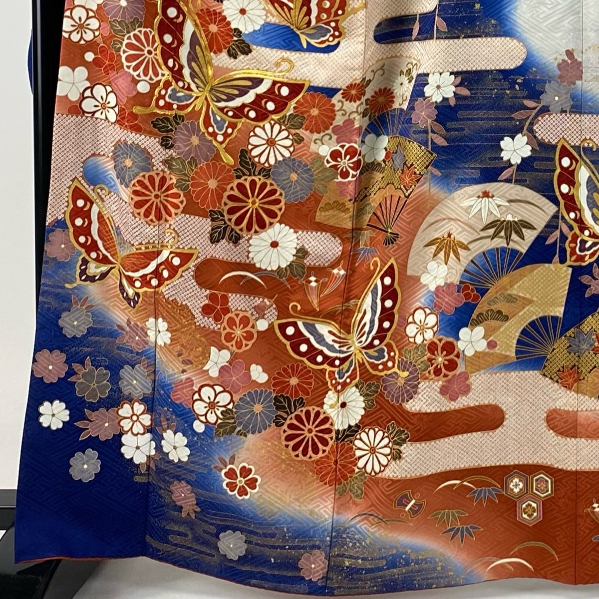 | 振袖 秀品 蝶 扇 金糸 金彩 青 袷 身丈166 裄丈68 L 正絹 【中古】 |