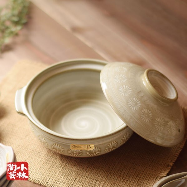 信頼の日本製土鍋(萬古焼)電子レンジ、オーブンも可(ガス火用) 【サイズ 】 内径:18 取っ手までの含む幅:24.5 高さ:12.8(フタあり)8.3(フタなし)cm 【 材質 】 胴部分:耐熱陶器(ペタライト)フタ:陶磁器 【 容量 】 1500ml(1-2人用) 【 質感 】 なめらかな手触り ※日本製(萬古焼) ※電子レンジ ※釉薬の溜まりなどで色むらや濃淡が出ることがありますがご了承の上ご購入ください。 ※土鍋の取り扱い注意事項 ・土鍋は水分を吸いやすいので一旦冷ましたらすぐに洗ってください。 ・傷がつきやすいのでクレンザー等は使わずスポンジで優しく洗ってください。 ・洗ったら水分を拭き取り、鍋底を上にして自然乾燥させてから収納しましょう。 ・完全に乾くまでは絶対に火にかけないでください。温度変化に対応できず割れてしまうことがあります。 ※用途 鍋/雑炊鍋/ちゃんこ鍋/水炊き/湯豆腐/炊飯/炊き込みご飯 銀峯,国産,日本製,花三島,土鍋,炊飯,土鍋ご飯,一人用,おしゃれ,炊飯器,(ギフト 贈り物 誕生日 結婚祝い 結婚記念日 開業祝い 開店祝い オープン祝い 移転祝い 開所祝い お歳暮 )