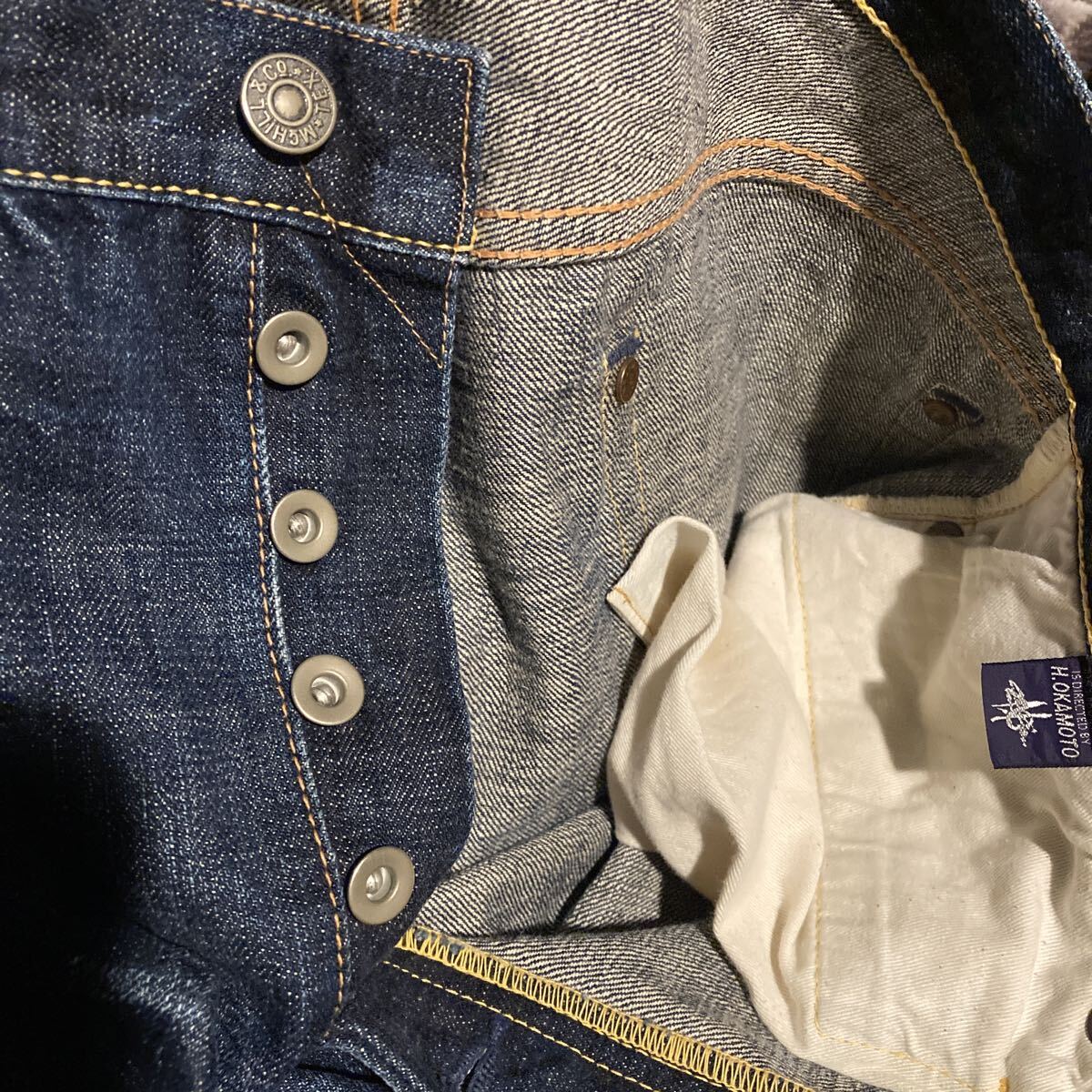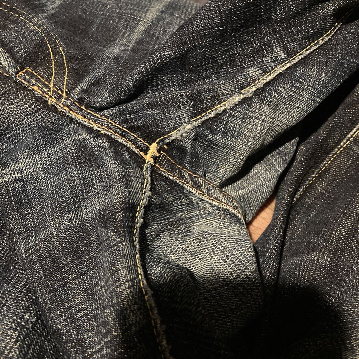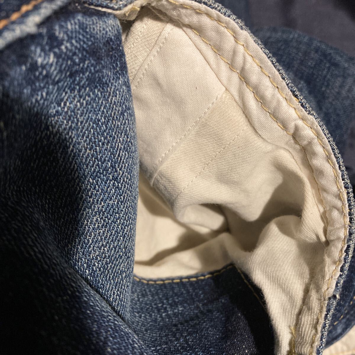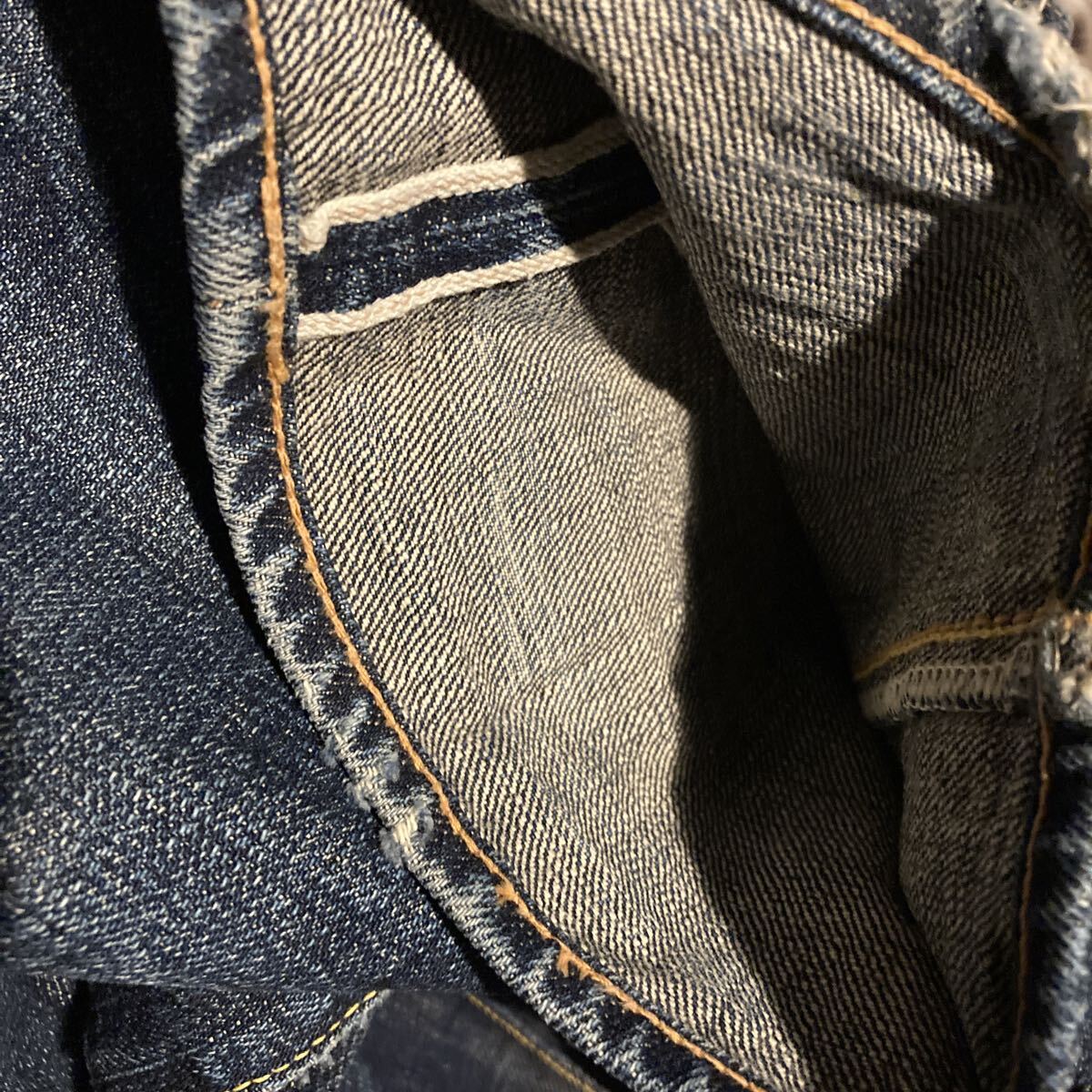 使用状況 :中古で使用感あり画像のようにバックポケット、股部分にダメージあり、左ポケットの中の白い生地にやぶれあったため児島のリフォーム屋さんで補修しております。