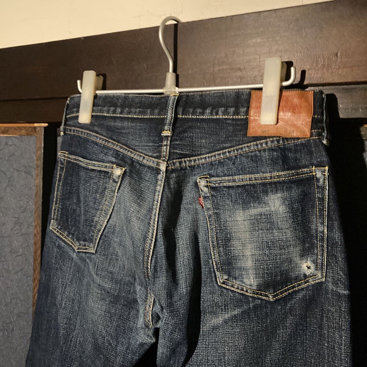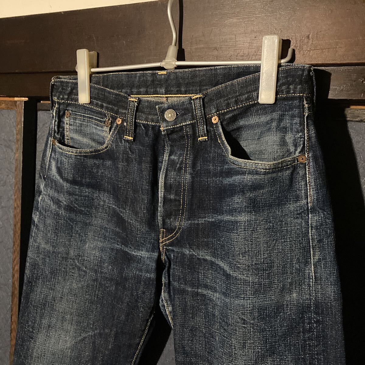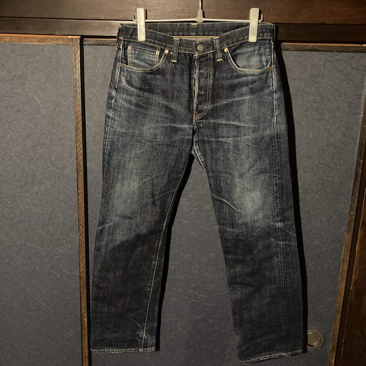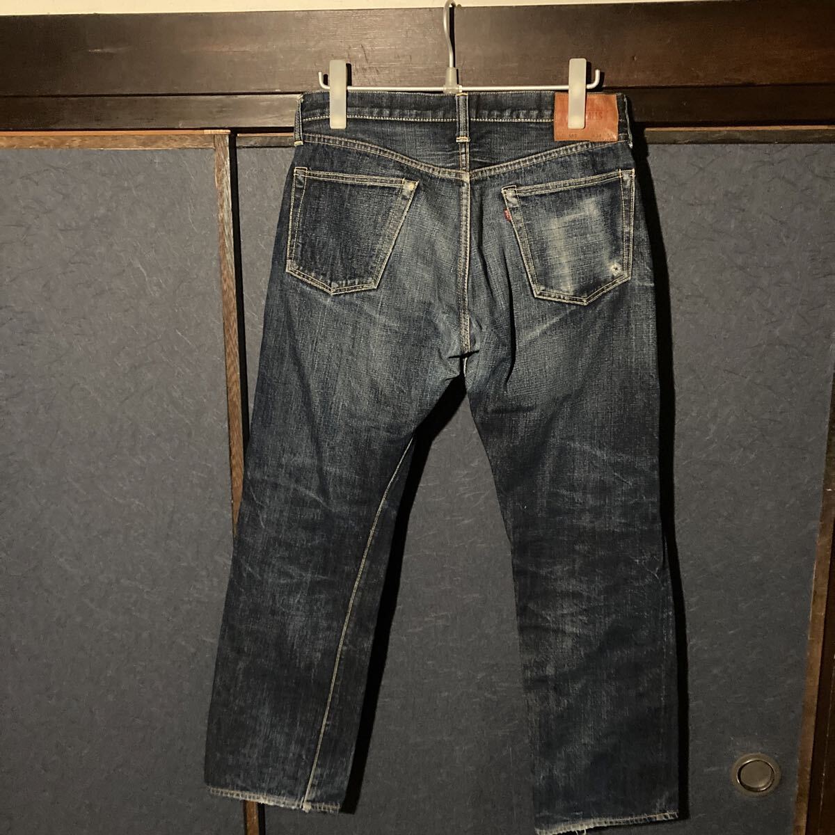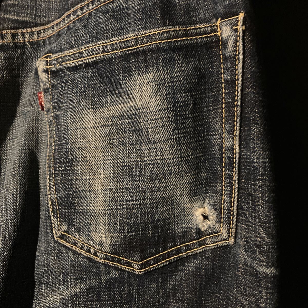 使用状況 :中古で使用感あり画像のようにバックポケット、股部分にダメージあり、左ポケットの中の白い生地にやぶれあったため児島のリフォーム屋さんで補修しております。