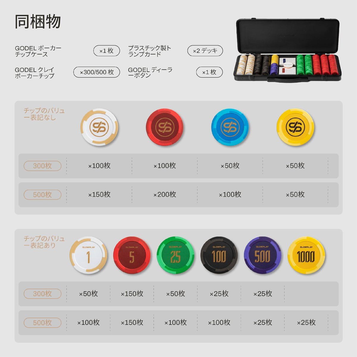 【在庫限りです】即決価格★テキサスホールデム用クレイポーカーチップセット,500枚14gSLOWPLAYGodel[チップバリュー表記あり]