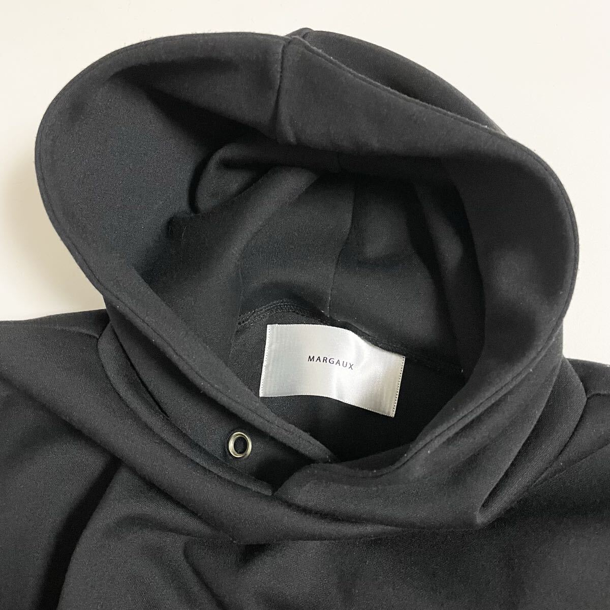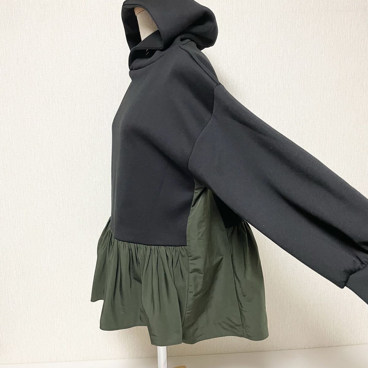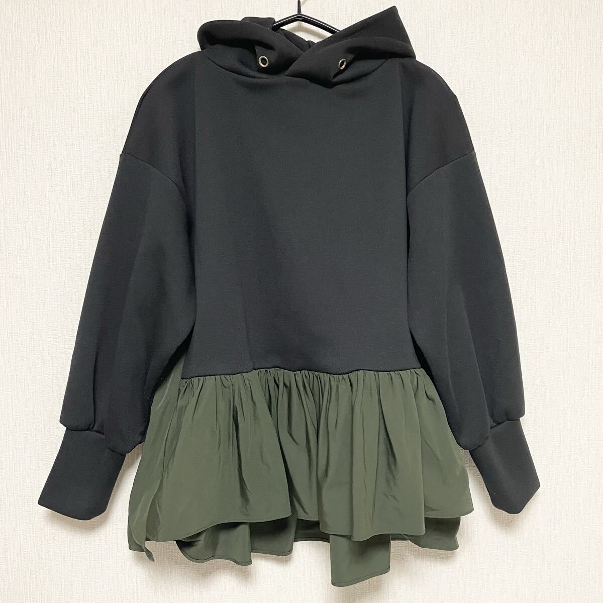 即決☆MARGAUX マルゴー ドッキング ペプラム パーカー 異素材 ブラック×カーキ フード 長袖