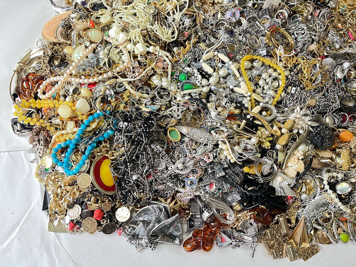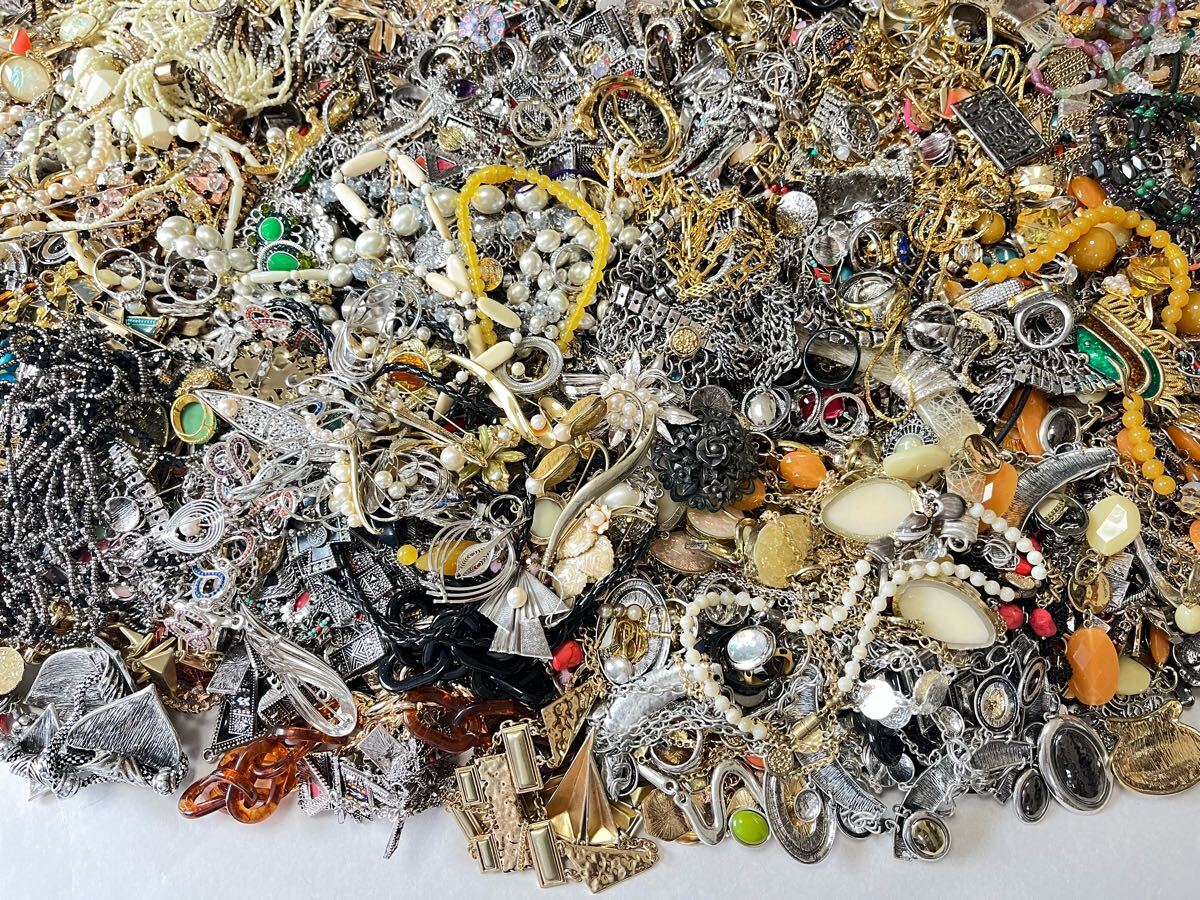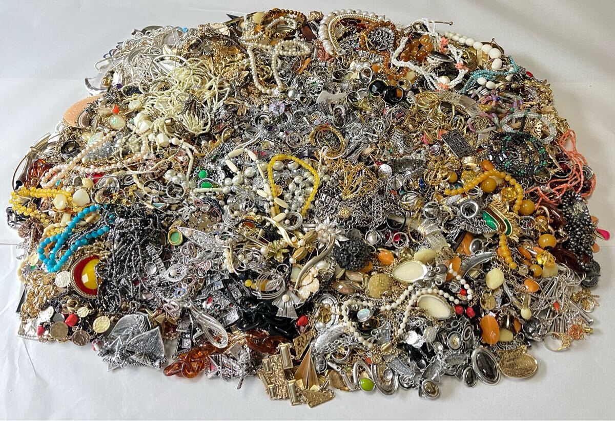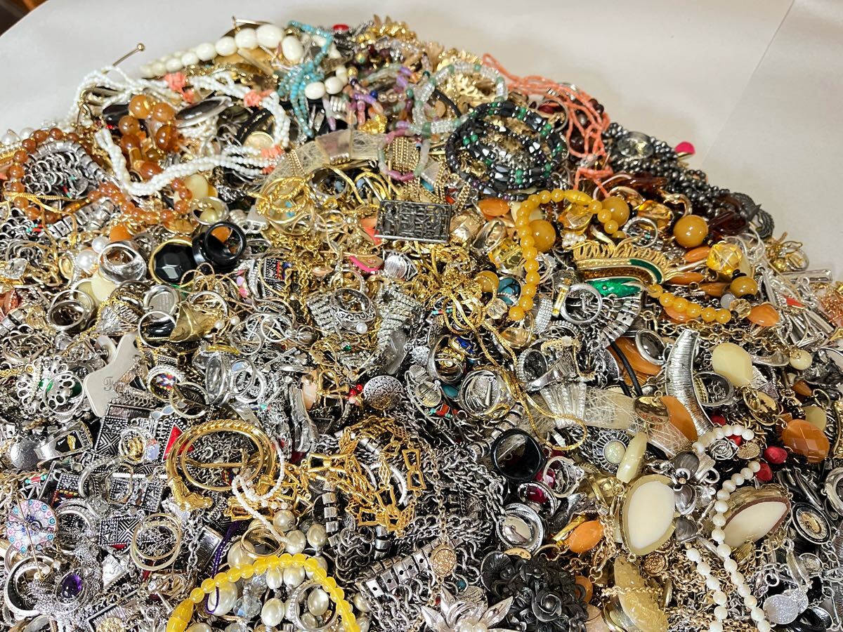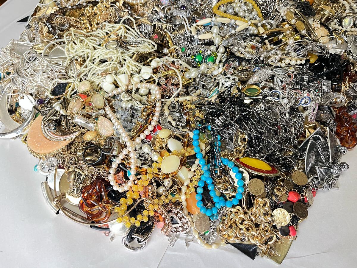 本商品は、ネックレス、ブローチ、イヤリング、カフス、タイピン、リング(指輪)、メッキ・ゴールド・シルバー(刻印含む)・アンティーク調・現代品等を多数組み合わせた、おまとめ約30kgセットです。写真に写っているものが全てとなります(画像をご確認ください)。