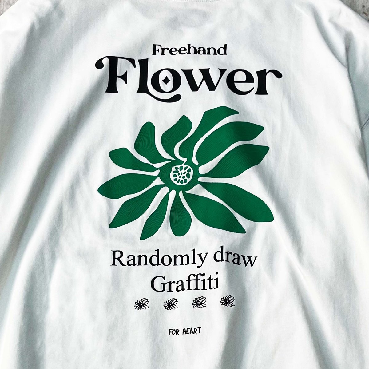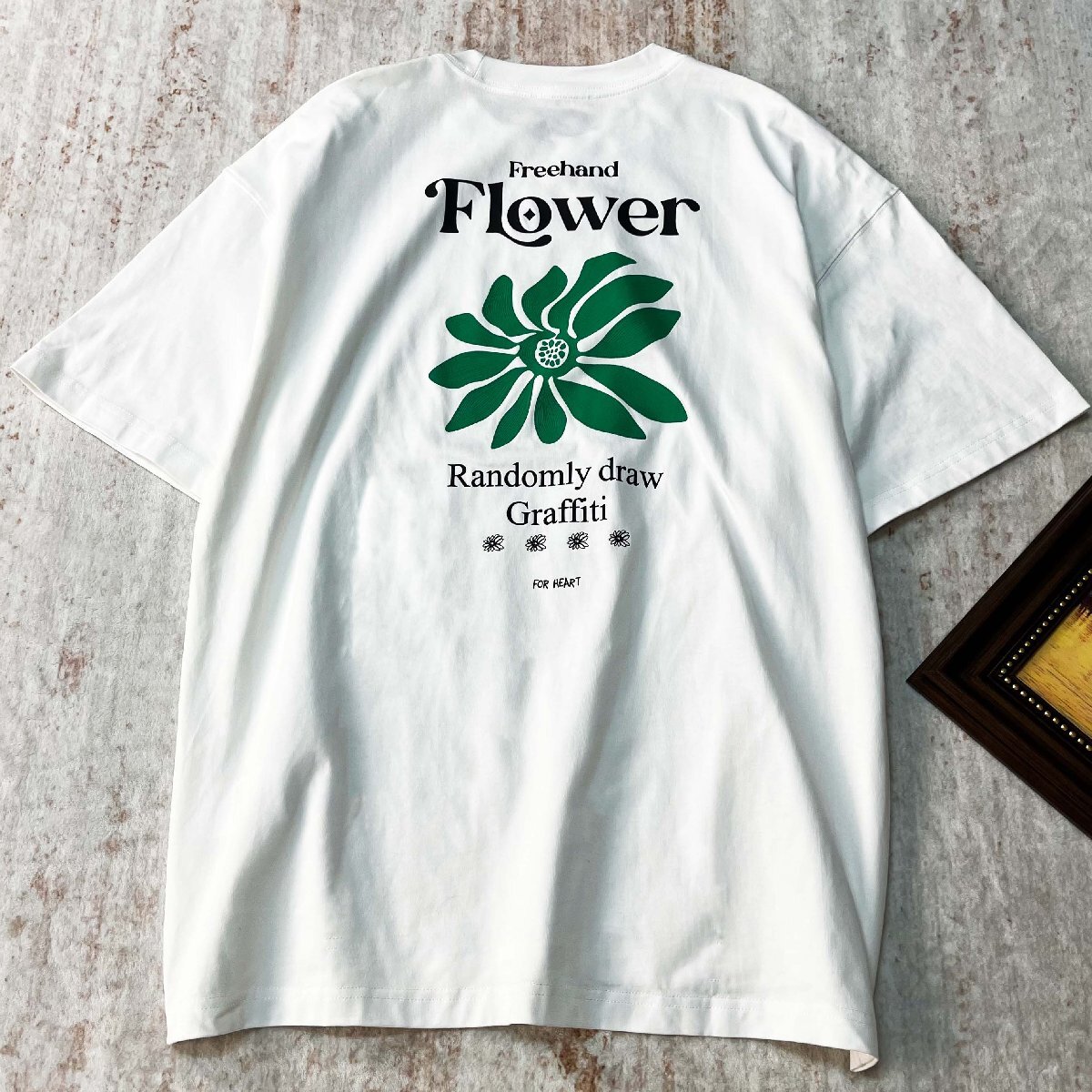 ストリート系の流行を取り入れたおしゃれなバックプリントで、シンプルながらも個性を演出。左胸にはワンポイントデザインを施し、前後どちらの視点から見ても魅力的なスタイルを楽しめます。ゆったりとしたサイズ感が体型を自然にカバーし、リラックスした雰囲気でおしゃれを楽しめます。