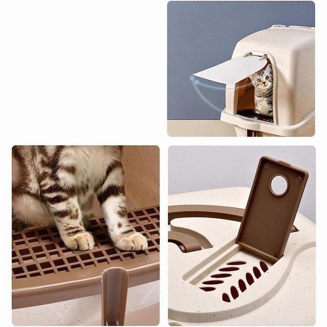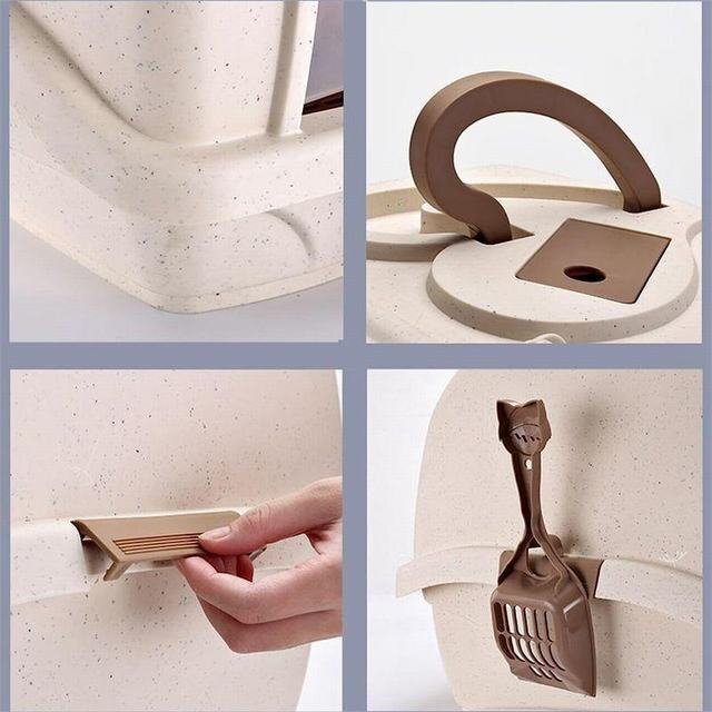 猫の足に付着した砂が落ちやすように、ふたの溝で猫砂をキャッチして飛び散りを防ぎます。部屋の清潔を保てます。 本体に付いているバックルをトレーから外して、分けて丸洗いできます。※洗った後はしっかりと乾かしてからご使用ください。 外見はスマートですが、中は広々大容量です。 内寸の奥行が58cmもあるので方向転換がしやすく、大型のネコちゃんもゆったり使用できます。 お部屋に置いても圧迫感を感じさせない、丸みとシャープさを兼ね備えたデザインです。 余分なパーツが無く、スッキリとしたスタイリッシュなトイレです。