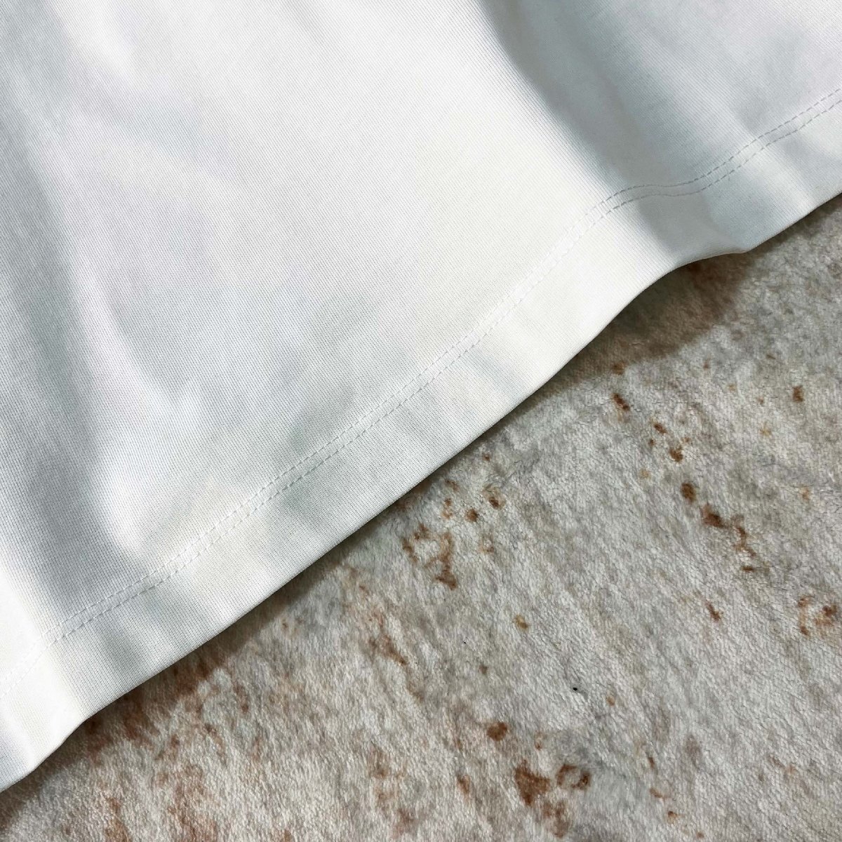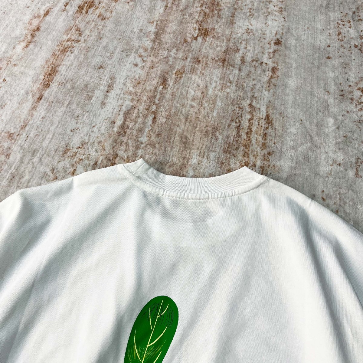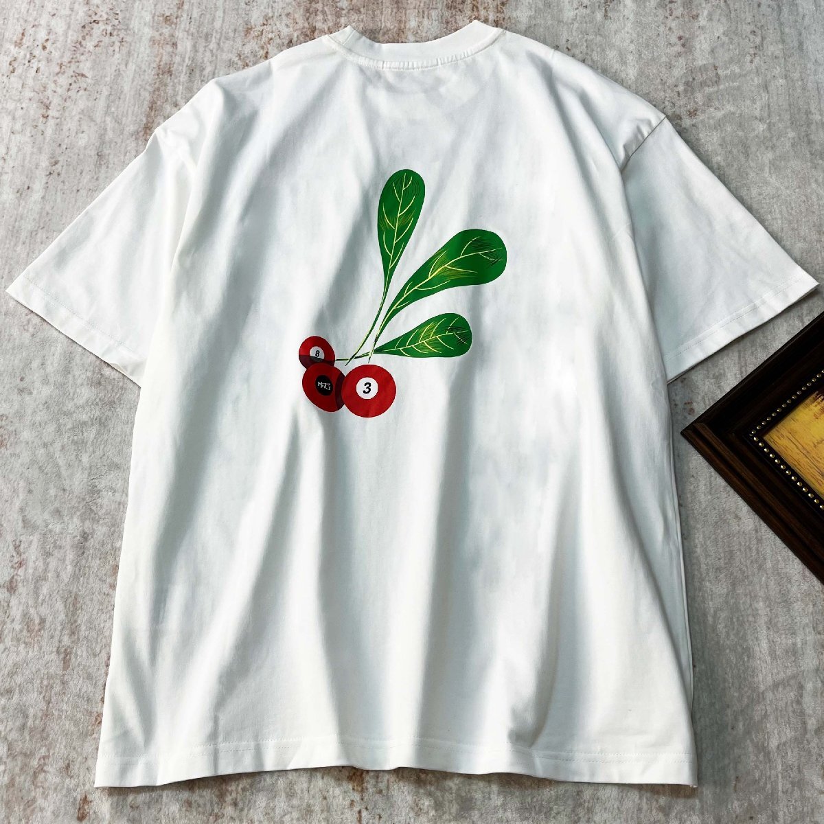 胸元にはシンプルでおしゃれな英文ロゴを配置し、背中にはフルーツのプリントを施した、遊び心のあるデザインが特徴です。少しゆったりとしたサイジングながらも、バランスの良い丈感にすることで、だらしなく見せない。