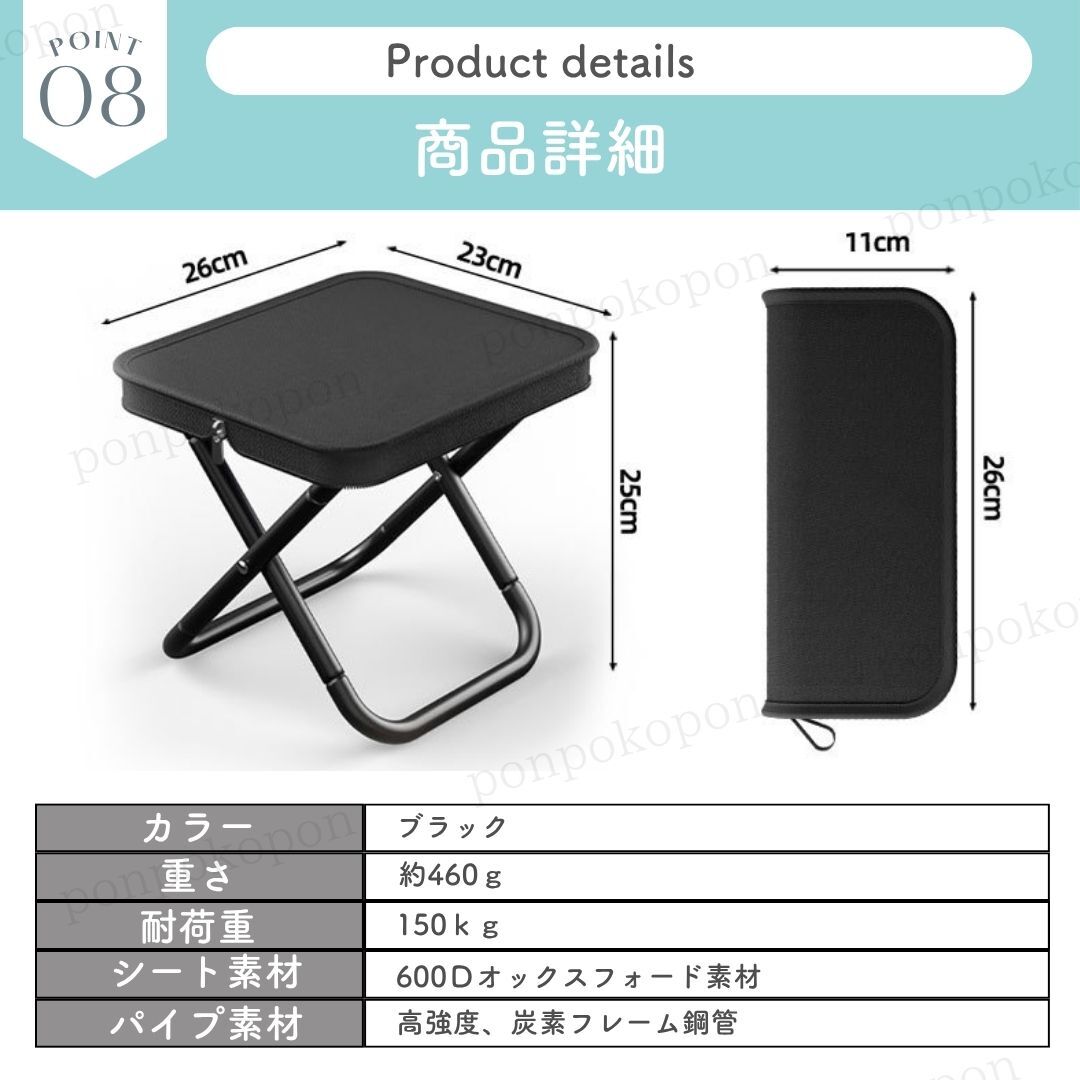 ○折りたたみ収納チェア(座面が収納ケースになる!) 【おすすめポイント】 ◆ 座面が収納ケースに! イスとして使わないときは、座面がそのまま収納ケースに変身。ちょっとした小物を入れるのにとっても便利! 【とっても軽いのにしっかり安定】 重さは約460g(ペットボトル1本分ほど)なのに、なんと150kgまでしっかり支えてくれる頑丈な作りです。 【持ち運びらくらく】 折りたたんでコンパクトになるので、リュックやバッグにすっぽり入ります。ピクニックや旅行、ちょっとしたお出かけにもぴったり。 【安心の丈夫な素材】 アルミフレームと強い生地(600Dオックスフォード)を使っていて、長く安心して使えます。 【水にも強い撥水素材】 水をはじきやすく、通気性も良好。急な雨やアウトドアシーンでも安心! 【こんなときに大活躍!】 キャンプ、釣り、登山、ビーチ、花火大会、フェス、防災用の備えなど、ちょっと座りたい場面にとっても便利です。 【商品情報】 使用時サイズ:縦26cm × 横25cm × 高さ24cm 収納時サイズ:縦26cm × 横11cm 重さ:約460g カラー:ブラック 素材:アルミ(脚部分)、オックスフォード生地(座面) ≪注意事項≫ ※できる限り実際の商品の色合い・イメージに近づけておりますが、パソコン、モニターの環境によって若干色合いなどが変わることがございます。 ※できる限り商品をお安く提供できるように、簡易梱包、商品によってはコンパクトに梱包しておりますので、ご了承ください。 《画像に関して》 ※画像転載を発見し次第通報します。 | |||