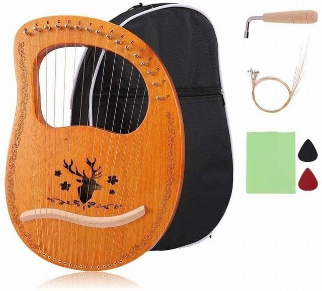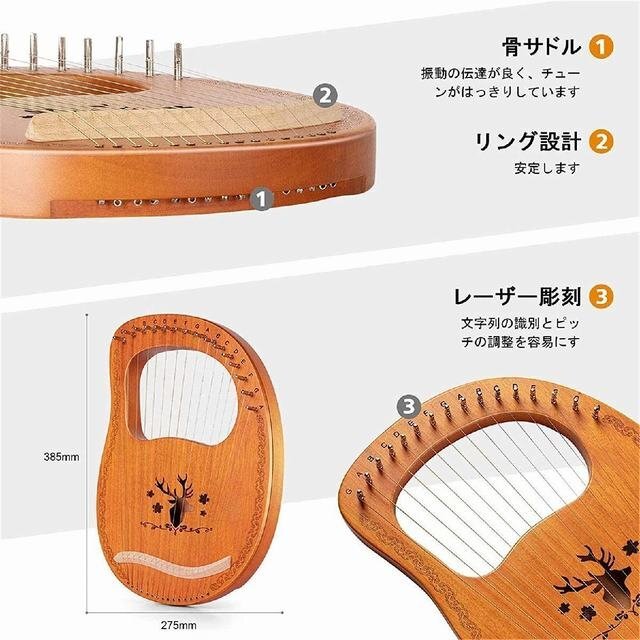 【サイズ】:掲載サイズ表をご参照ください。 【高品質素材】 楽器素材として人気のソリッド?マホガニー材を共鳴箱に使用しています。密度と硬さに優れているので、安定した音を奏でます。温かく柔らかい音色が特徴です。 【16弦】 1(G3),2(A3),3(B3),4(C4),5(D4),6(E4),7(F4),8(G4),9(A4),10(B4),11(C5) ,12(D5),13(E5),14(F5),16(G5)。16弦はより多くのメロディーやコードが弾けるので10弦や7弦と比べると楽譜の選択幅が広がります。丈夫なスチール弦を使用。ナイロン弦より耐久性が高く、長持ちします。 【精巧なデザイン】 エッジ部分が丸みを帯びており、安全で楽に抱きかかえられます。 音の振動が良く伝わる骨サドルを使用、またループ状のデザインなので音が安定します。サウンドホール周辺には美しいデザインが描かれており、精巧な職人技で丹念に表面が磨かれたライアーは非常に滑らかで繊細な造りになっています。 【持ち運び便利】 収納ケース付きなので、コンパクトにどこへでも持ち運びができます。旅先へ携帯して、演奏することも可能です。キット内に調律用ハンマーも含まれており、時計回りまたは反時計回りに回転させて、弦の張りを調整出来ます。 【素敵なプレゼント】ライアーハープは家族でのパーティー、学校での演奏、アウトドア、レジャー等あらゆる場面で大活躍します。初心者から音楽のプロの方にもお薦めのプレゼントです。 【注意事項】 出荷前に点検と実施させていただいておりますが、輸送の関係で、ネジがゆるくなて、音が一部おかしくなる場合がございます。不良品ではありません、お客様ご自身でネジを少し締め付ければ直ります。ご了承ほどお願い致します。 モニターの環境等により、色の見え方に若干差が生じる場合がございます。