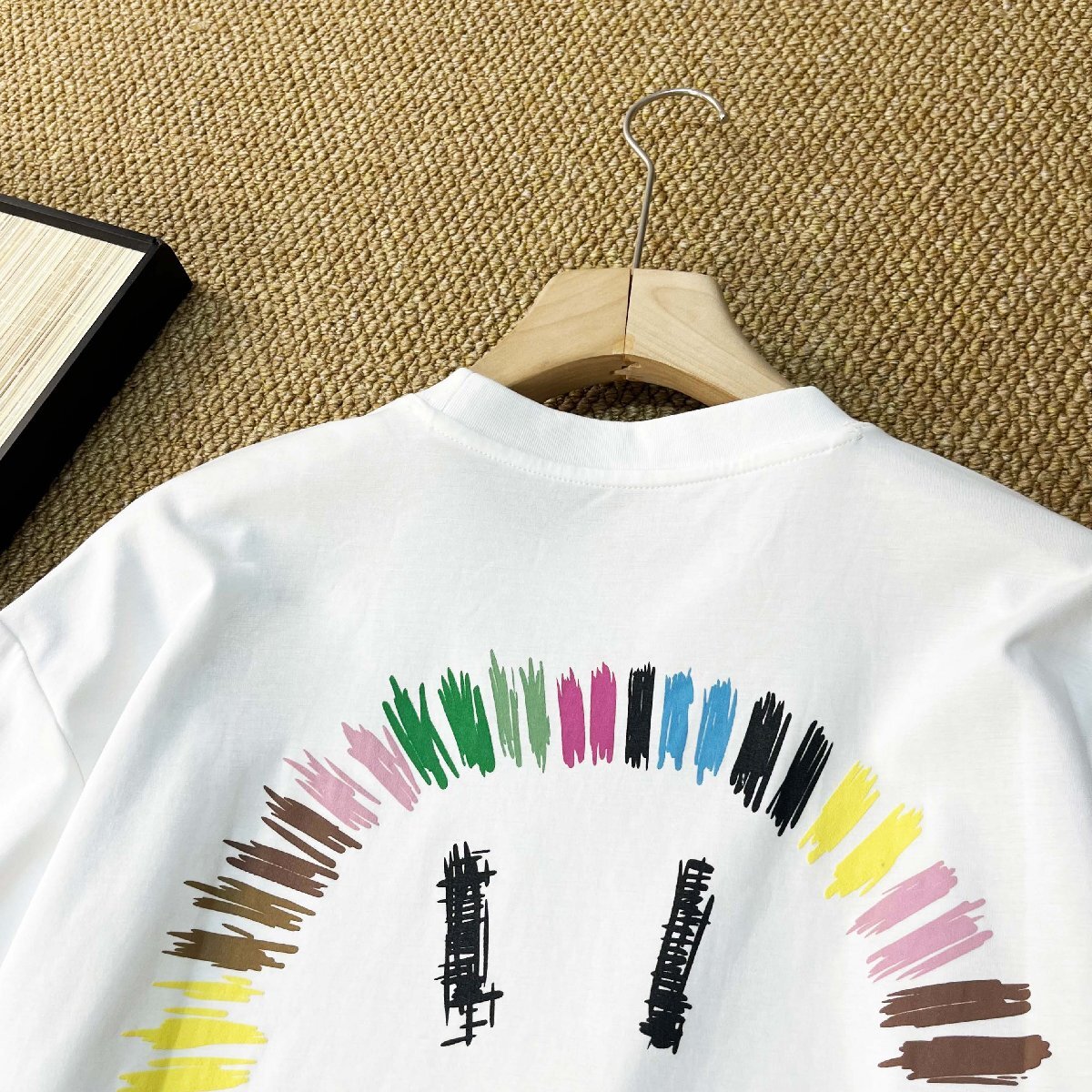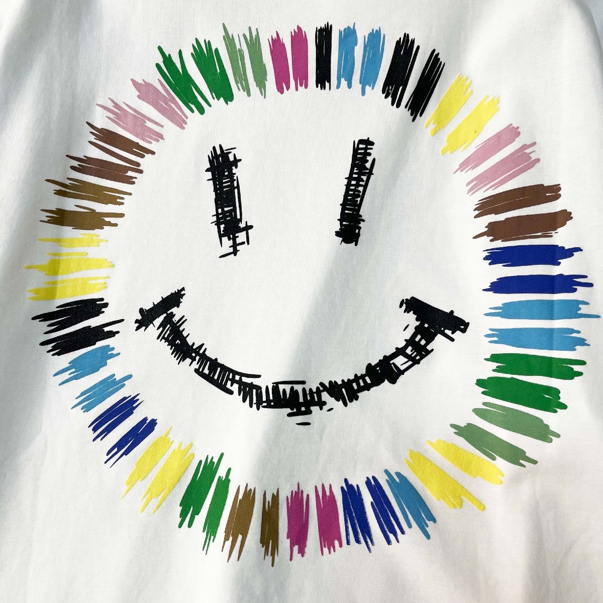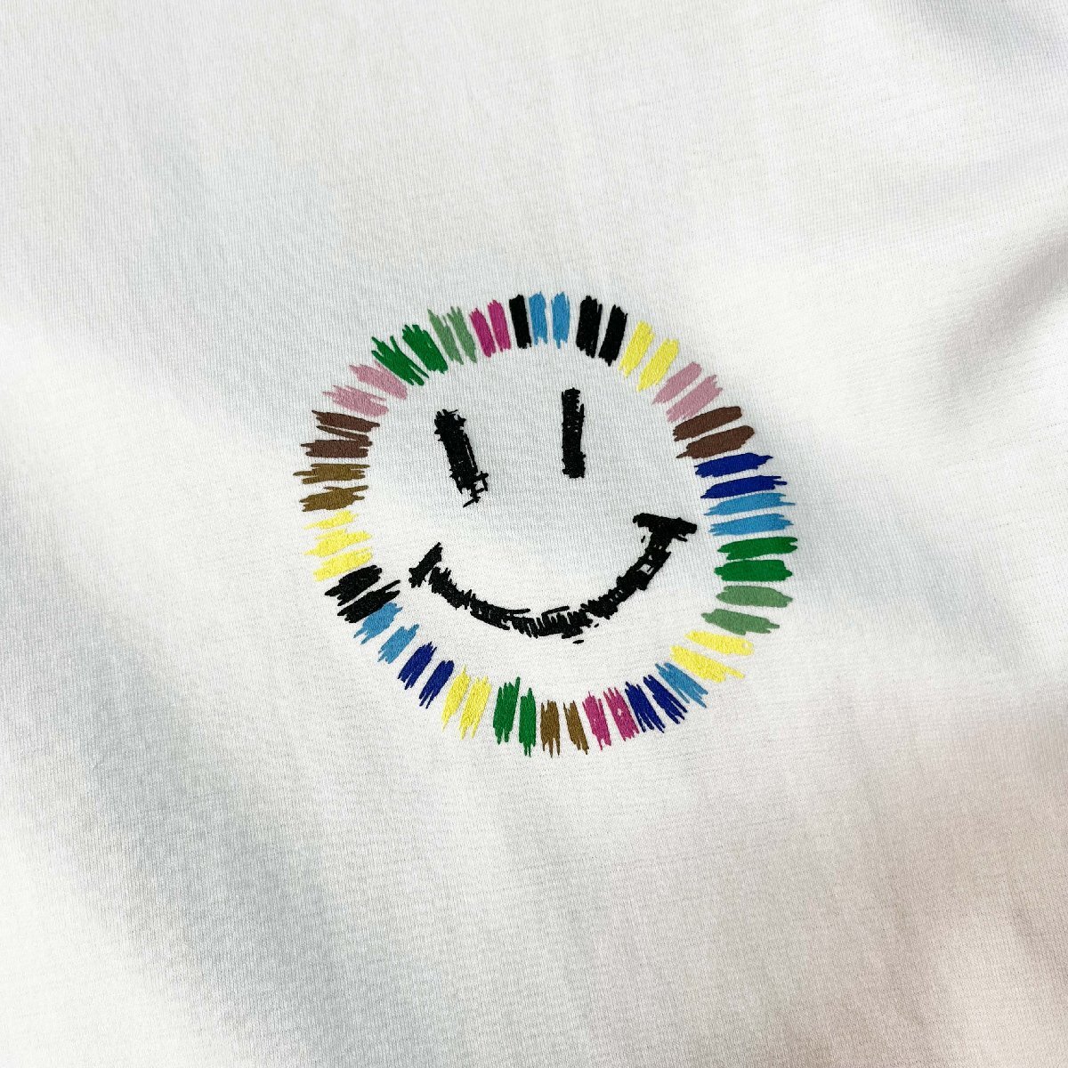 ベーシックなクルーネック&無地デザインに、カラフルなラインで描かれた“笑顔”モチーフが目を引く一枚。ポップで可愛らしい印象ながら、大人の方にも楽しんでいただけるデザインに仕上げました。