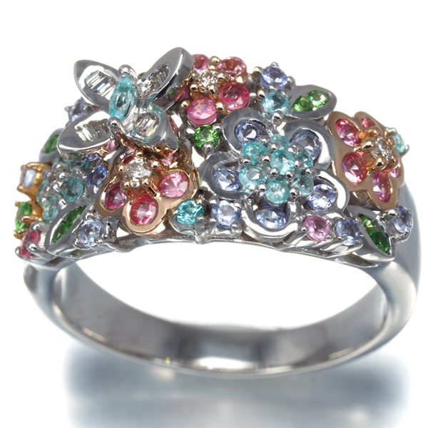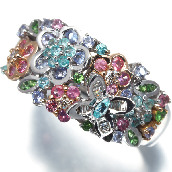 瑞々しい潤いから 彩り豊かな煌めきを魅せるフラワージュエリー。パライバトルマリンやタンザナイトの稀少宝石に、上質ダイヤモンドの透明感溢れる輝きを散りばめた とても華やかな一品。立体的なシルエットに繊細に飾られた宝石達が 装いをより美しく輝かせます。 |