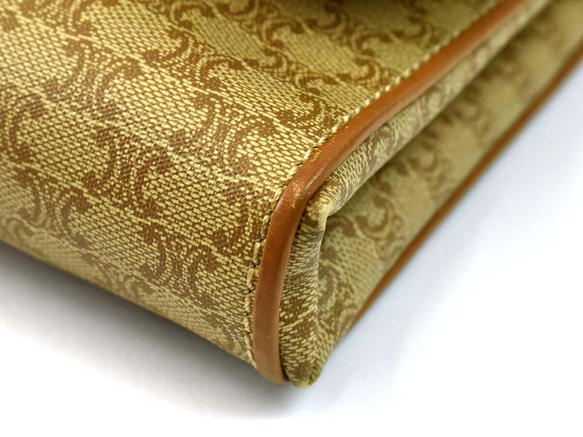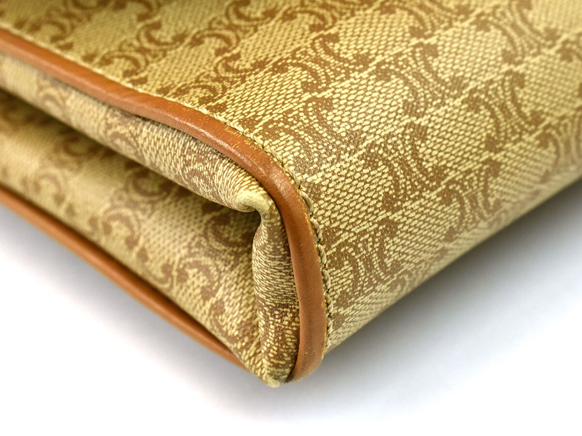 外側コバに黒ズミ、角に剥がれ、ショルダーにヨレ・シミ・割れ・ヒビ、内側角にシミ、金具広範囲にキズ・メッキ剥がれがございますが、いずれもご使用には差し支えなく、まだまだお使いいただける商品です。 |