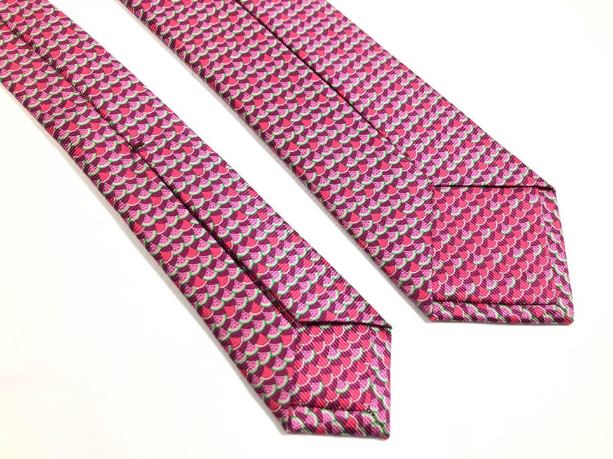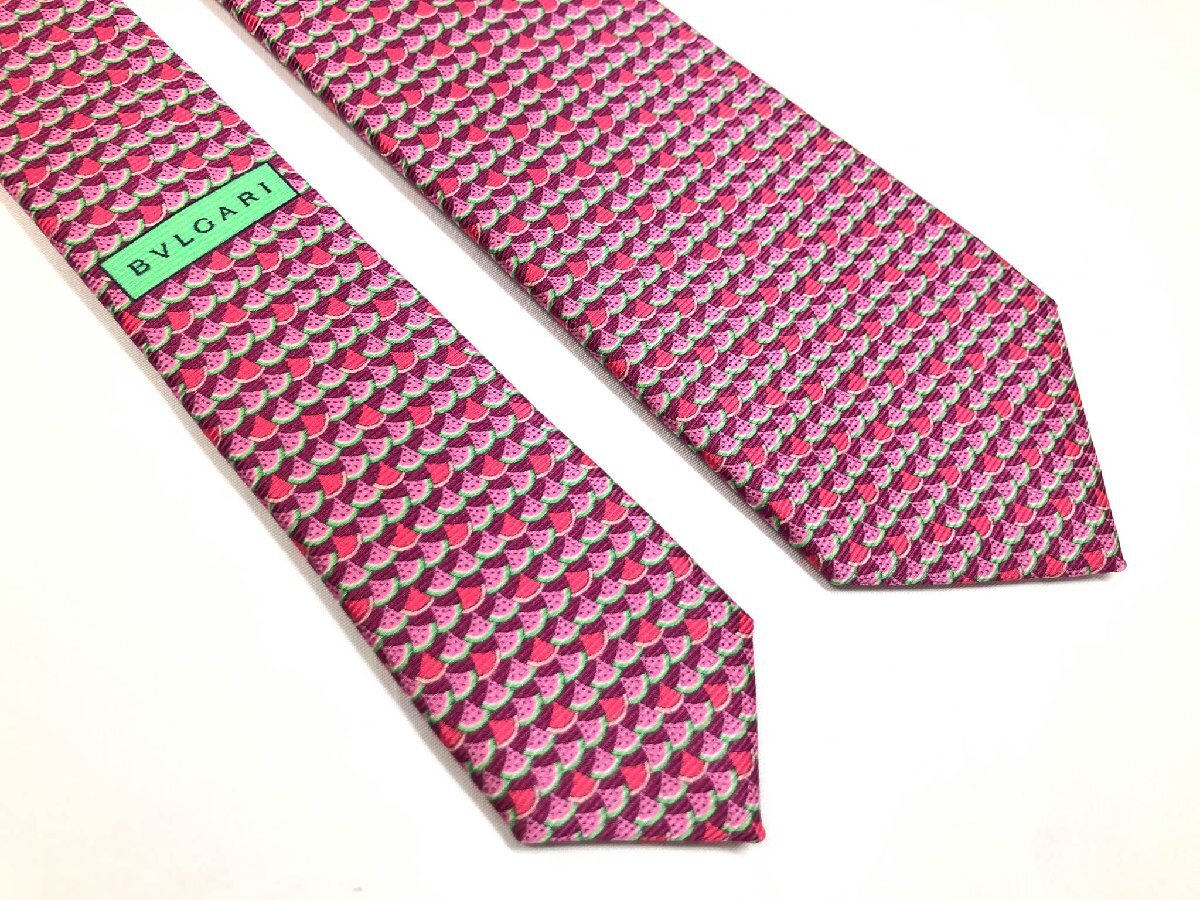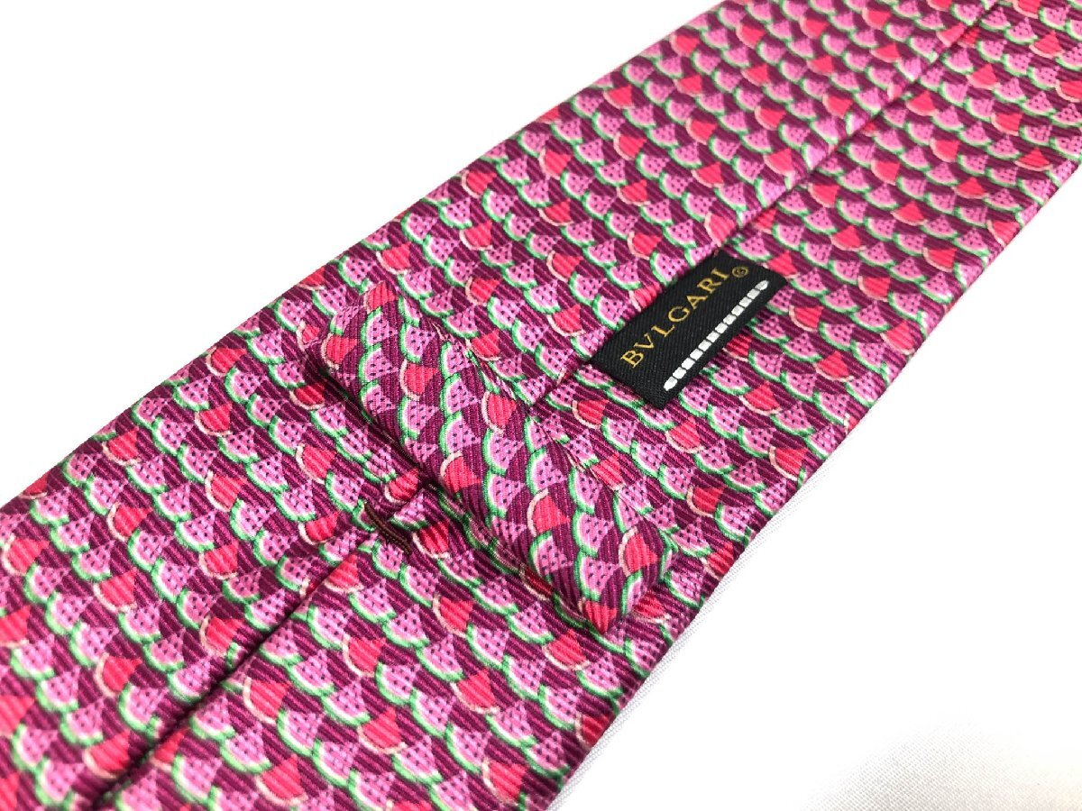 極美品【ブルガリ BVLGARI】セッテピエゲ風 お洒落なスイカプリント柄♪ シルク ネクタイ (メンズ) ピンク系 伊製 ◇17MM8703◇