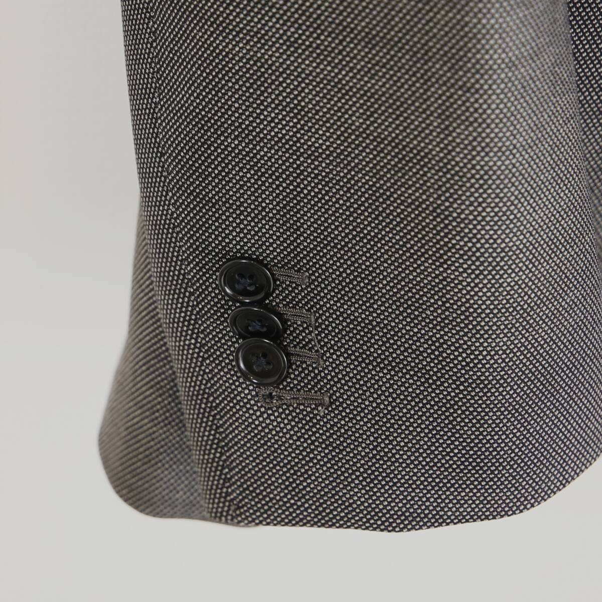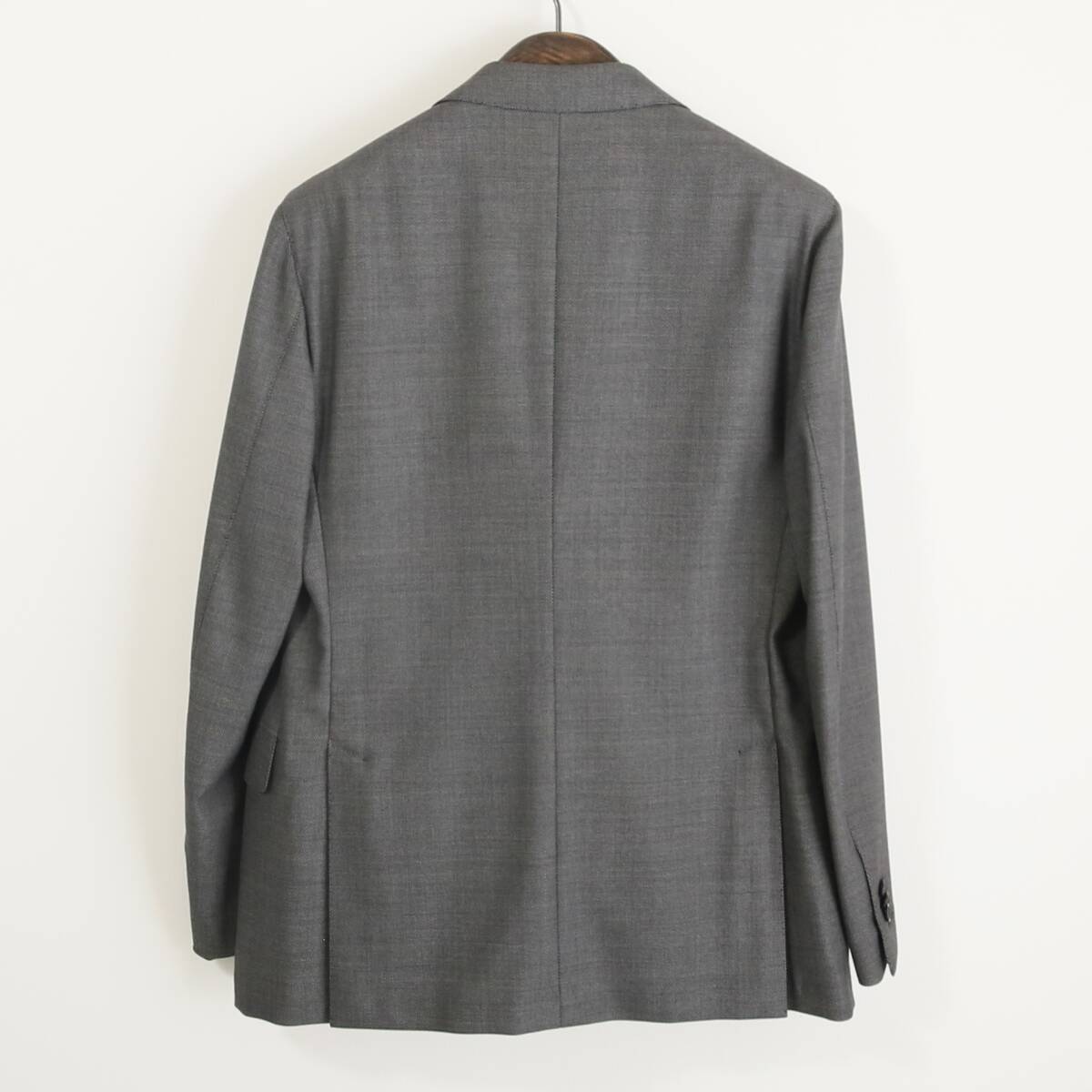 3ボタン段返り、サイドベンツ、胸バルカポケット、脇フラップポケットで袖は本切羽の4つ釦重ね。
