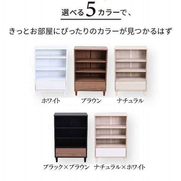 | 【カラー】 ホワイト、ブラウン、ナチュラル、ブラック×ブラウン、ナチュラル×ホワイト 【サイズ】 <外寸> 幅60×奥行29.5×高さ90(アジャスター80.5)cm <内寸> オープン部:幅56×奥行25.5×高さ57.5cm 可動棚:幅56×奥行25.5×厚み1.5cm(3.2cmピッチ9穴) 引き出し:幅51×奥行23.5×高さ9.5(有効11)cm 【材質】 <ホワイト> 本体:プリント紙化粧合板 天板:合成樹脂化粧合板(PVC) 引き出し前板:合成樹脂化粧繊維板(PVC) 脚:天然木 <ブラウン、ナチュラル> 本体:プリント紙化粧合板 引き出し前板:プリント紙化粧繊維板 脚:天然木 <ブラック×ブラウン> 本体:プリント紙化粧合板 天板:合成樹脂化粧合板(PVC) 引き出し前板:プリント紙化粧繊維板 脚:天然木 <ナチュラル×ホワイト> 本体:プリント紙化粧合板 引き出し前板:合成樹脂化粧繊維板(PVC) 脚:天然木 【耐荷重】 天板:(約)10kg以下 可動棚:各(約)5kg以下 固定棚:(約)5kg以下 引き出し:(約)5kg以下 【生産国】 中国 【梱包】 サイズ:82.3×33×16.5cm、重量:15.5kg 【その他】 ・可動棚2枚 ・背面化粧なし ・脚裏フェルト付き ・アジャスター付き 【組み立て品】 お客様による組み立てが必要です。 【ご注意】 ・サイズ、重量は概算です。 ・商品カラーはご使用のモニターによって実際の明るさや色と異なって見える場合がございます。 |
