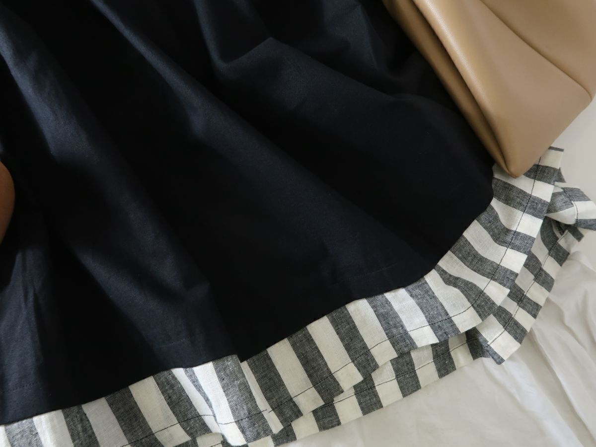 ストライプのベースの上に、無地のスカートを重ねたデザインが印象的なスカート。