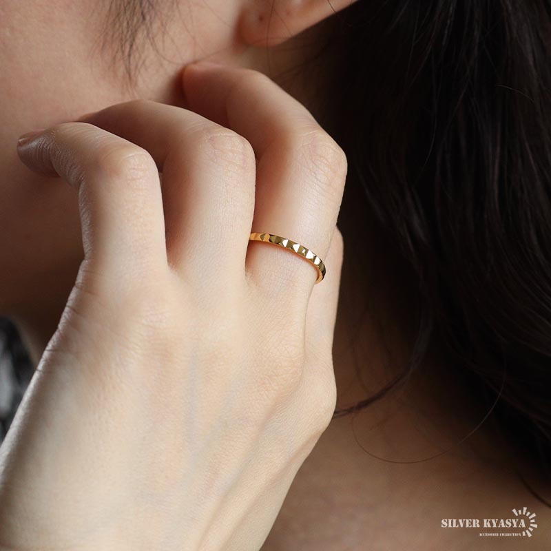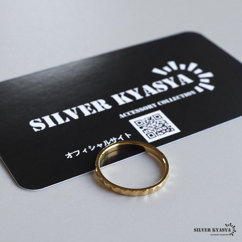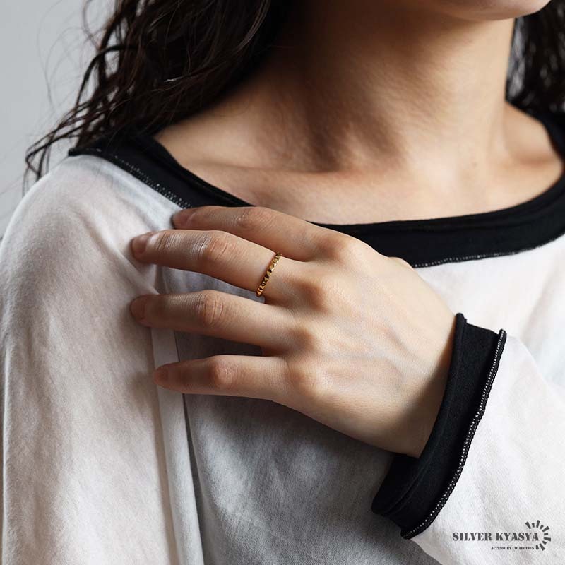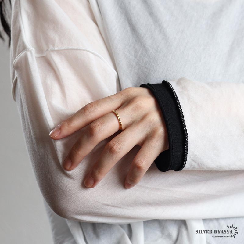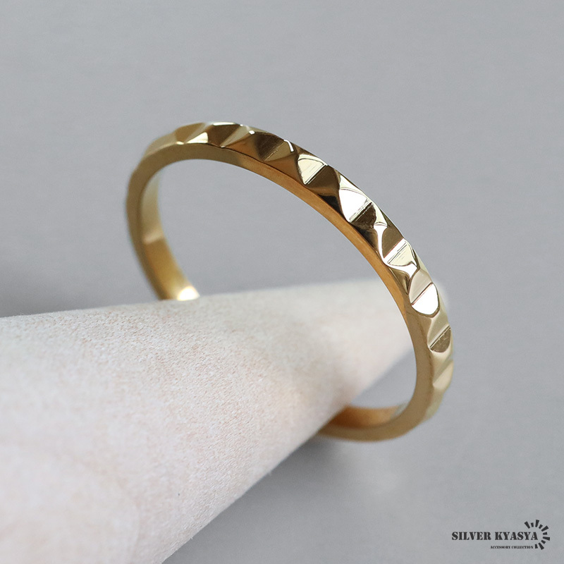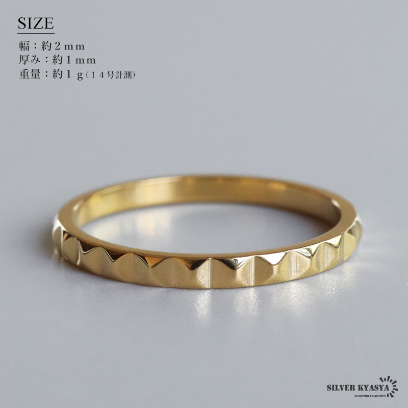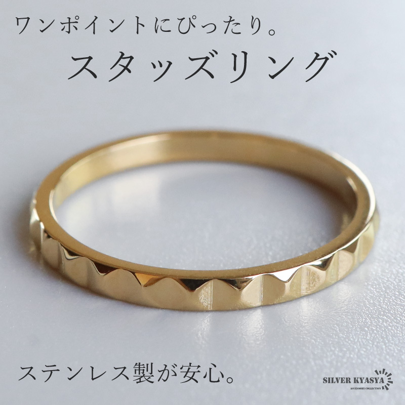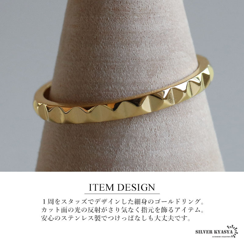 1周をスタッズでデザインした細身のゴールドリング。カット面の光の反射がさり気なく指元を飾るアイテム。安心のステンレス製でつけっぱなしも大丈夫です。