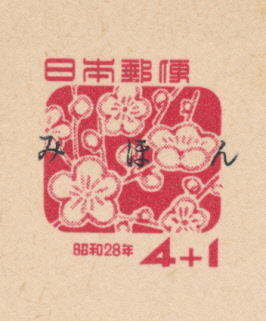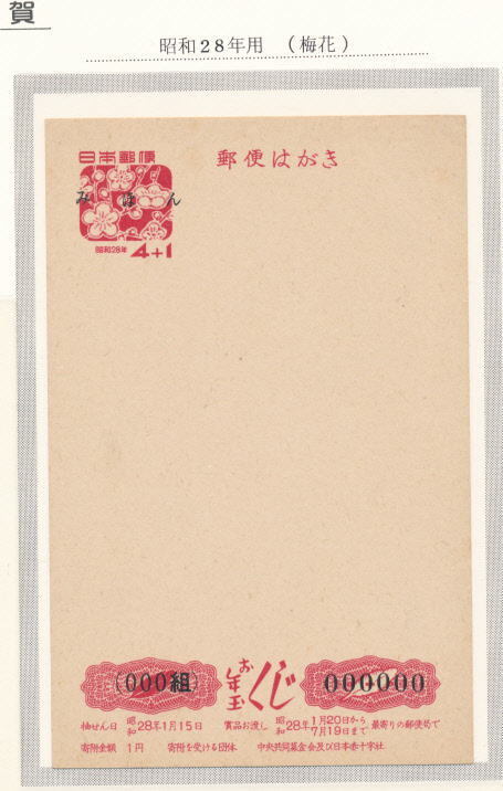 ■No 1★ みほん字入り・年賀はがき 昭和28年用(1953年)『梅花』/寄付金付・お年玉付 4円+1円 ■