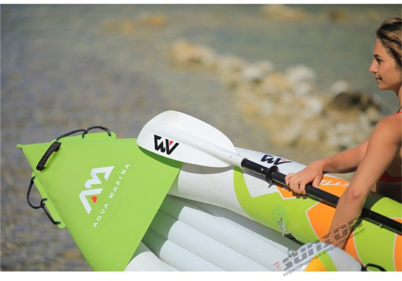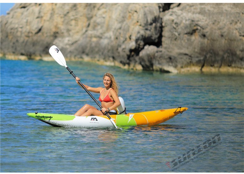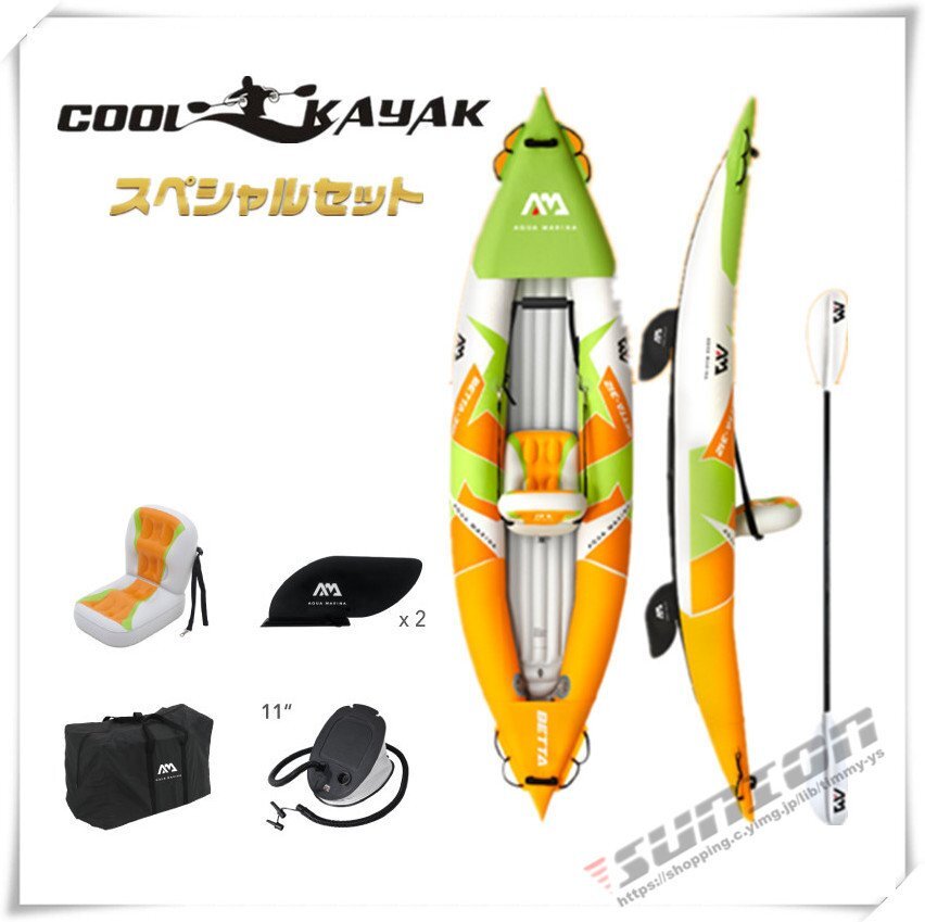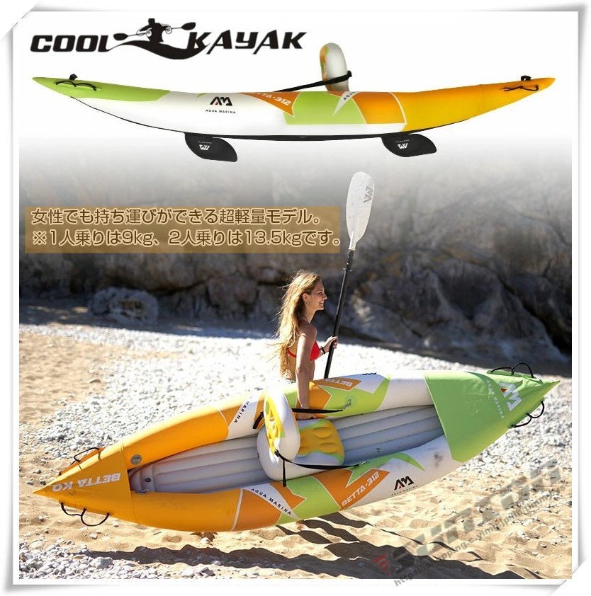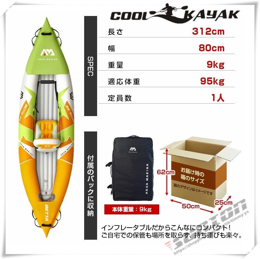 【商品SPEC】■長さ:312cm■幅:80cm■重量:9kg■適応体重:95kgまで■セット内容:本体、バッグ、フットポンプ、シート×1、パドル×1、フィン×2●持ち運びや保管に便利な、1人乗りインフレータブル式カヤック。●カヤック本体とイスを膨らませて取り付けるだけの初心者に最適な簡単構造。●角度の調節できるインフレータブルシートにより数時間のパドリングも楽々。●フロアに設置されたドレンバルブにて船体に入った水を排出し、最適な量に調節することが可能です。