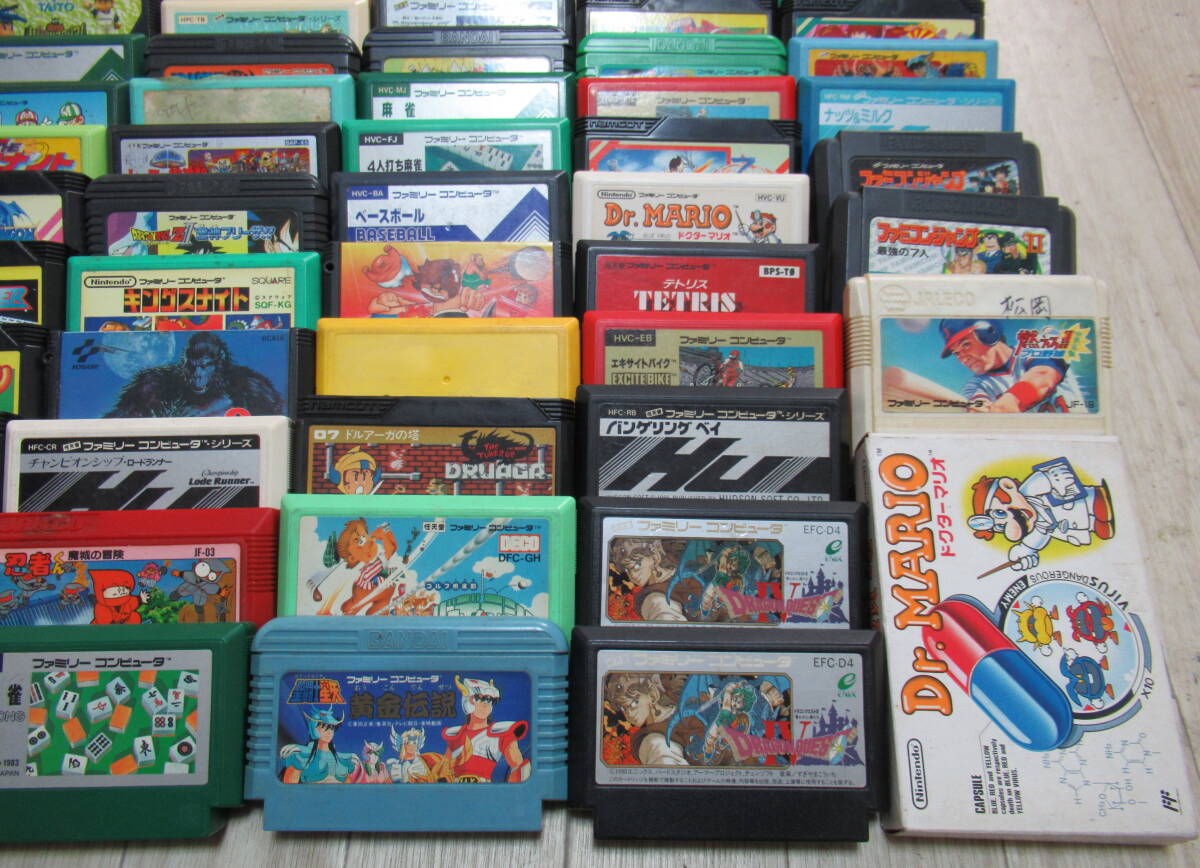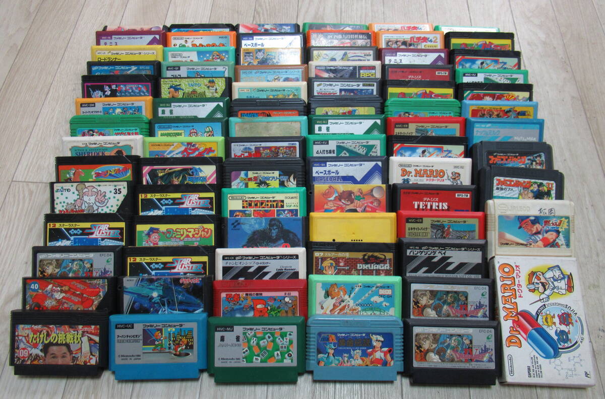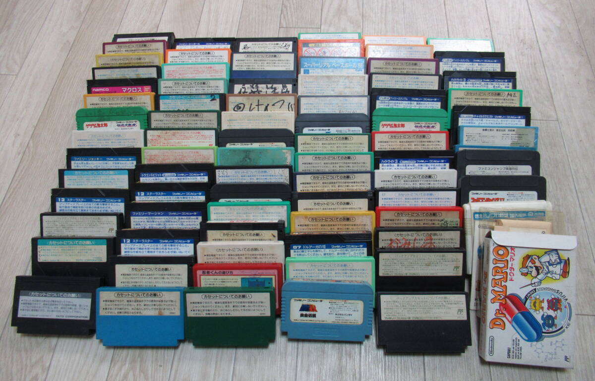 写真のものがすべてです。 ファミコンソフト81本となります。 重複タイトルあり。 すべてソフトについて動作未確認です。 このため、ジャンク扱いでお願いいたします。 ソフトの状態は様々です。 写真でご確認ください。 ※ドクターマリオのみ箱・説明書が付属しています ※ラベルがはがれているソフト(ゴルフ・ピンボール)があります ※キズ・記名・汚れているソフトがあります。 | ||