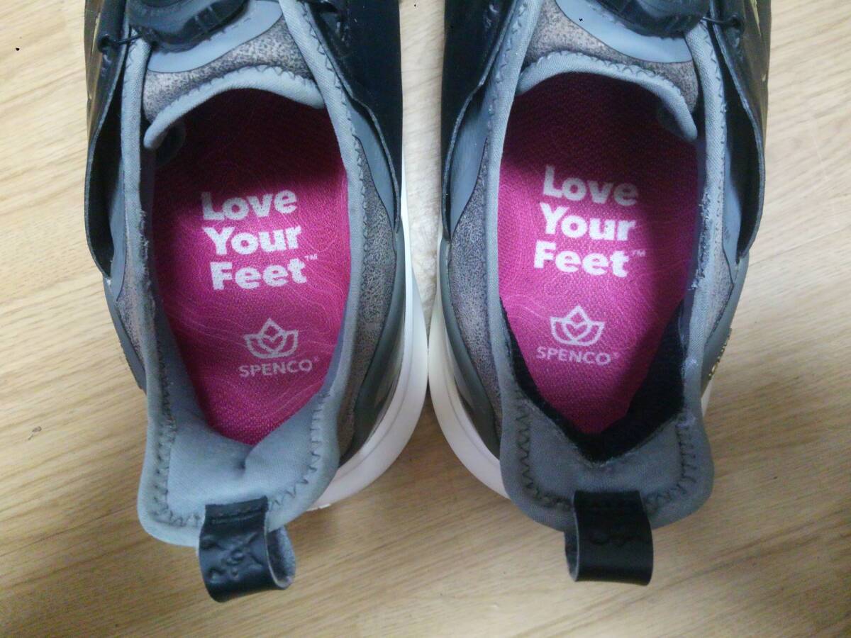 右足に約直径1㎝ぐらいの破れがあり、新品の靴擦れ防止パットを張り付けてあります。こちらの予備として使用できる又は左足用に1枚新品の靴擦れ防止パットが付属します。インソールは純正ではありませんが、機能性の高いSPENCOのインソールです。