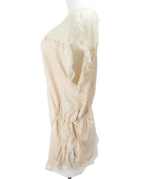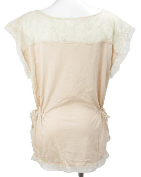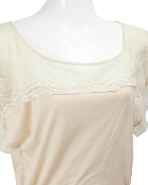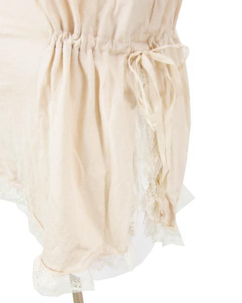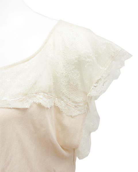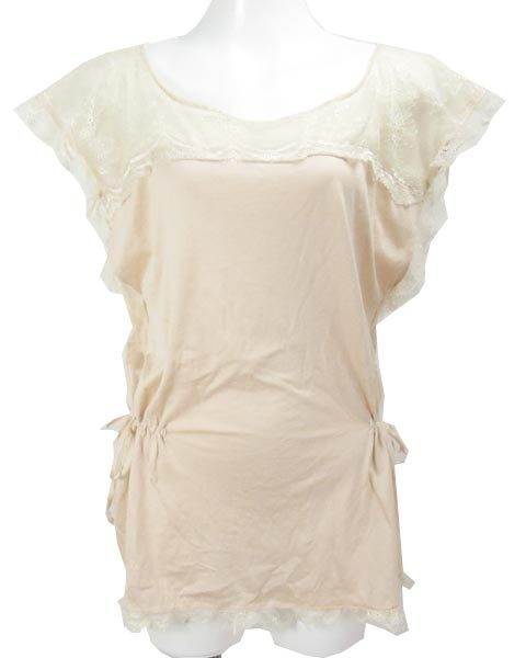 | さらっとした肌触りの良い生地のトップス。チュニック丈で白のスキニーパンツなどで甘めコーディネートはいかがでしょうか?薄オレンジと生成りのレースで優しい印象を与えてくれます。 |