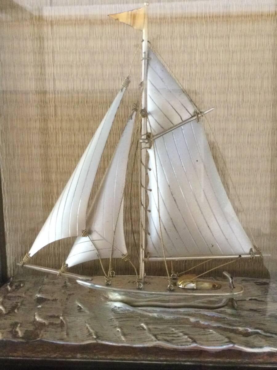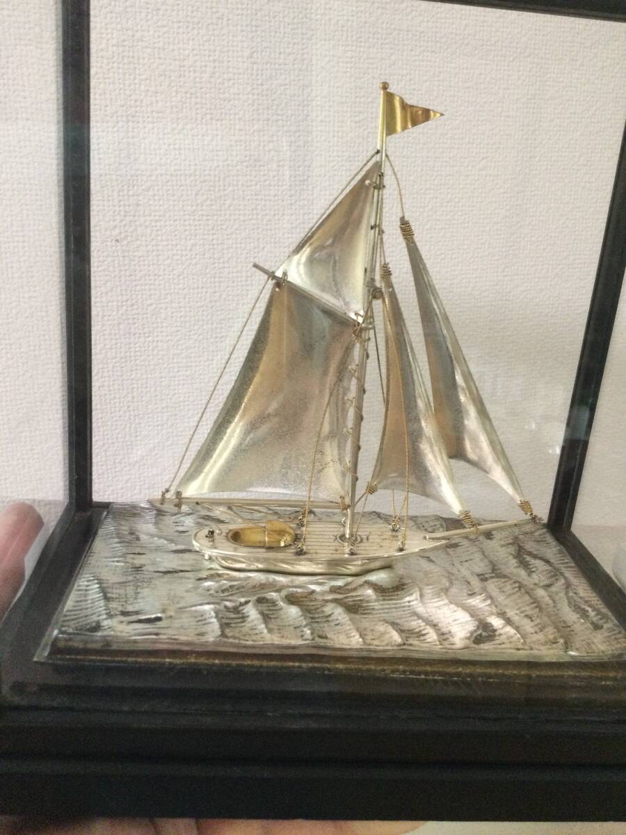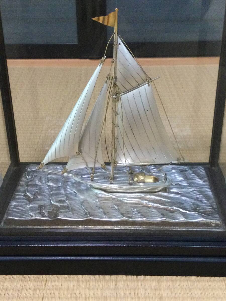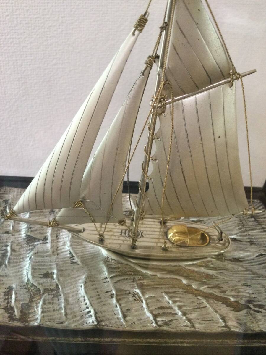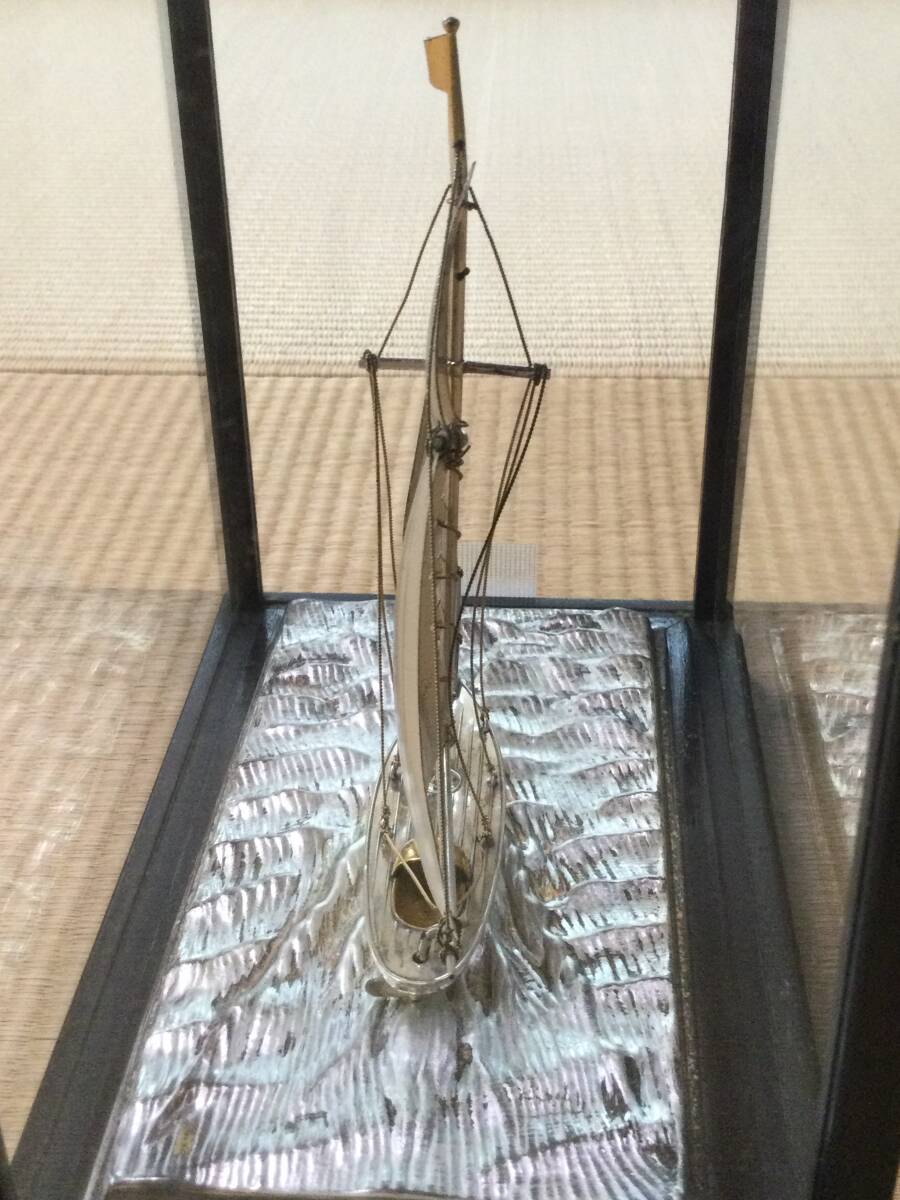 ケースごとの大体の大きさは20×19×12㎝です。また、ケースごとの大体の重さは749gです。写真の通りヨットに「銀製」の刻印があります。ヨットの輝く銀色、波の少し抑えた銀色、帆の光をしっかり抑えた銀色と、細部までこだわって作製された素晴らしい物です。オリジナルケース入りで、飾って楽しむのに最適です。(ケースは一応テープで止めてあります)金だけでなく、銀の価格も非常に高騰している昨今、この機会にゲットされたらいかがでしょうか。気に入られましたらどうぞよろしくご入札下さい。