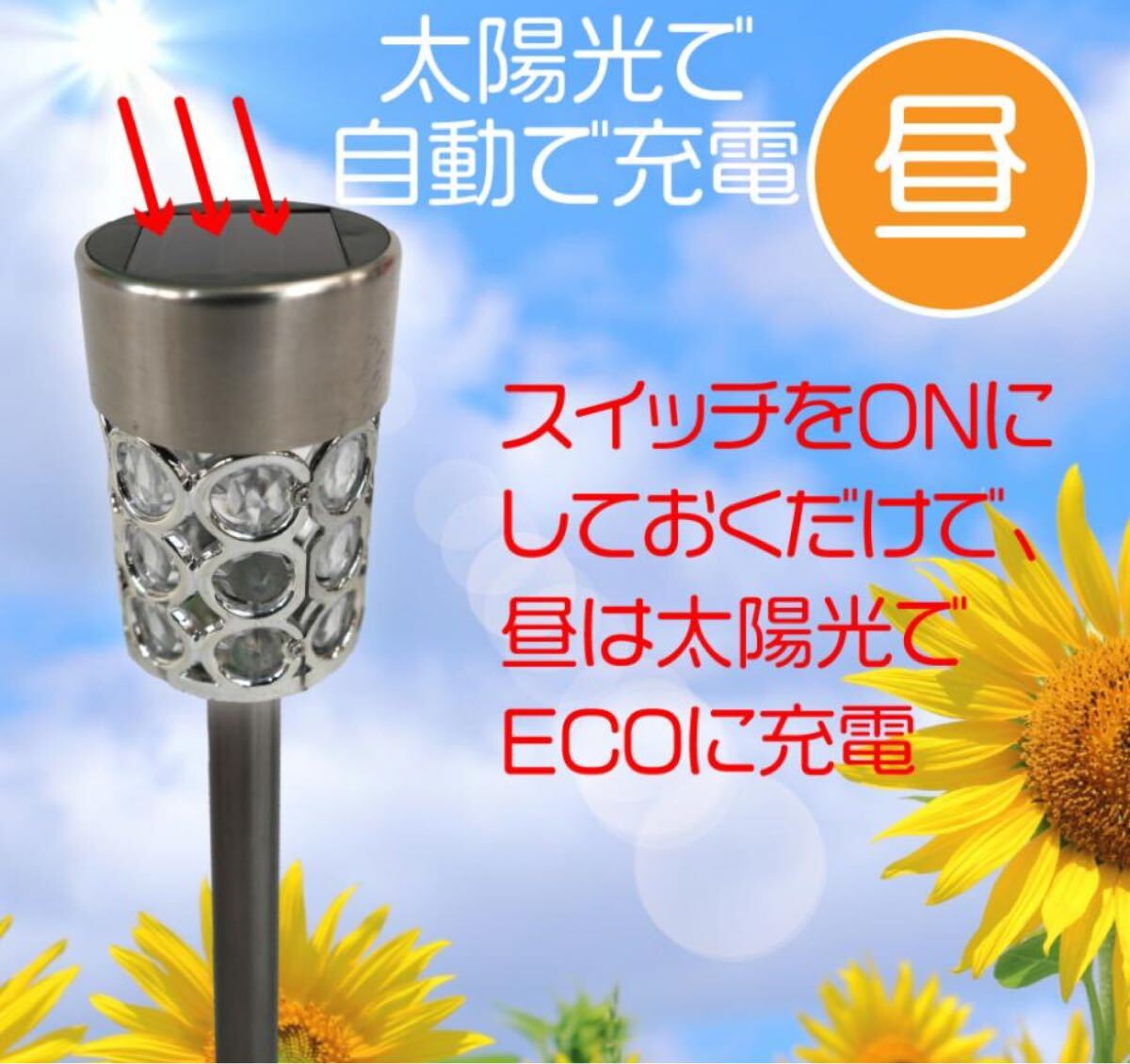 光を感知するセンサーが内蔵されており、暗くなると自動的にライトが点灯し、明るくなると自動的に消灯します。面倒な操作は一切不要です。