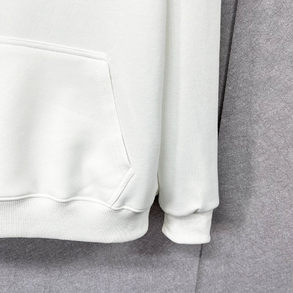 ベーシックで合わせやすいカラーなので様々な色のボトムスとも相性ばっちりです。バックには注目度抜群なプリントを配置、胸元にもインパクトのあるデザインがあり、ストリート感あるお洒落を演出、スタイリングをリードします。フロントのカンガルーポケットがあり、小物の収納に便利だけでなく、スポーティな印象を醸せます。