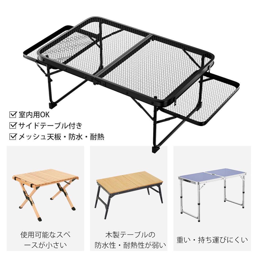 アルミ製キャンプテーブルは、軽さかつ耐久性に優れているのが特徴。手触りがよくて傷や汚れがつきにくく、メッシュ天板デザインで耐熱温度が300℃まで達し、錆びにくい、水と熱にも強いので、調理したばかりのフライパンや鍋をその上に置くのもオッケー。おしゃれな見た目でお手入れも簡単、汚れても丸々水洗いができ、実用性と耐久性を両立しています。