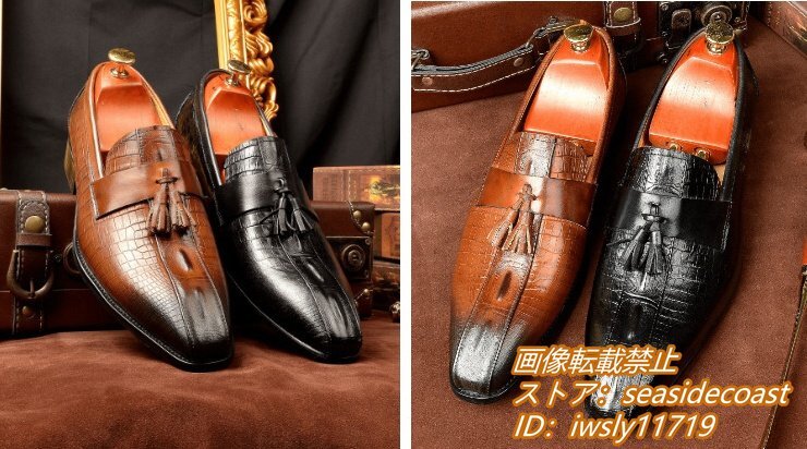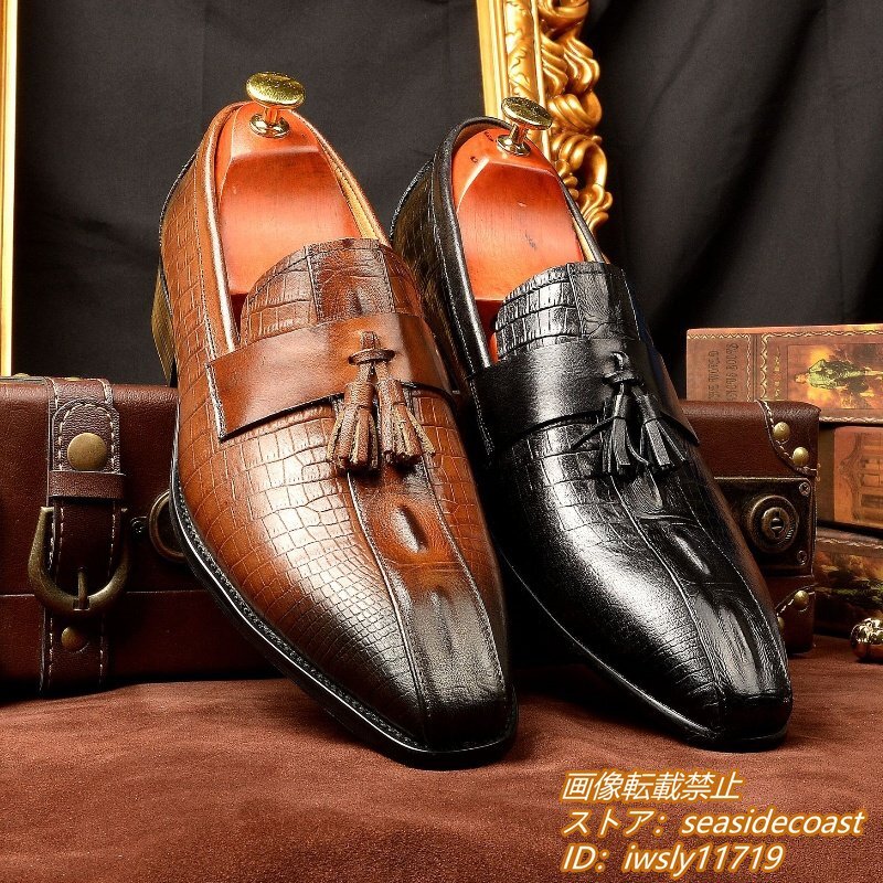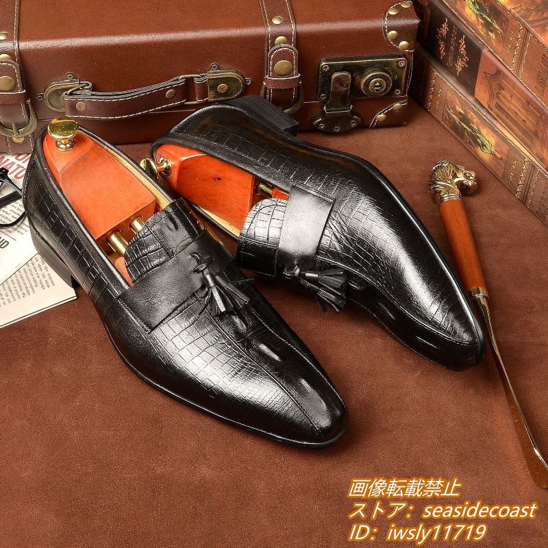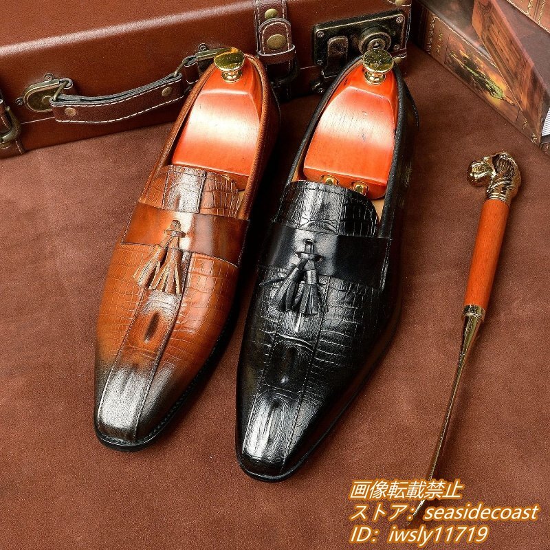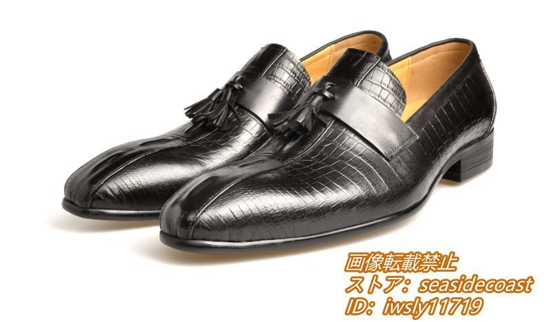 定価9万★最高級 牛革 レザーシューズ タッセル スリッポン ローファー 本革 ビジネスシューズ 鰐柄 職人手作り 紳士 革靴 ブラック 24.5cm
