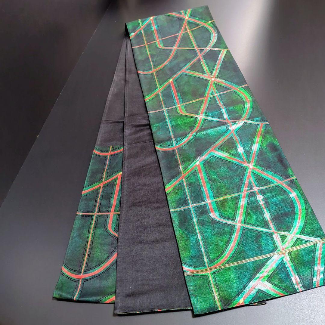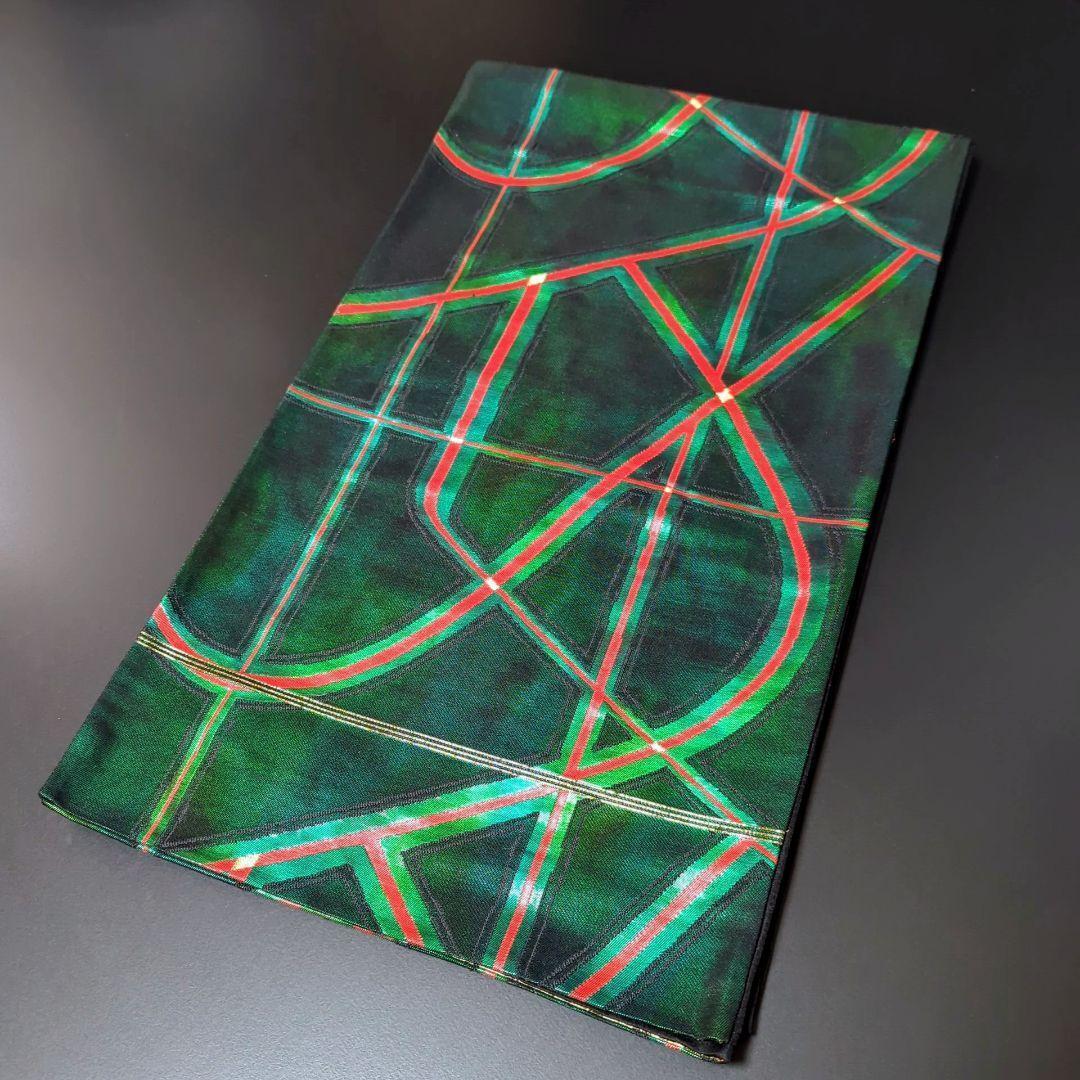 H-601 袋帯 正絹 六通 漆箔 幾何学模様 緑 グリーン