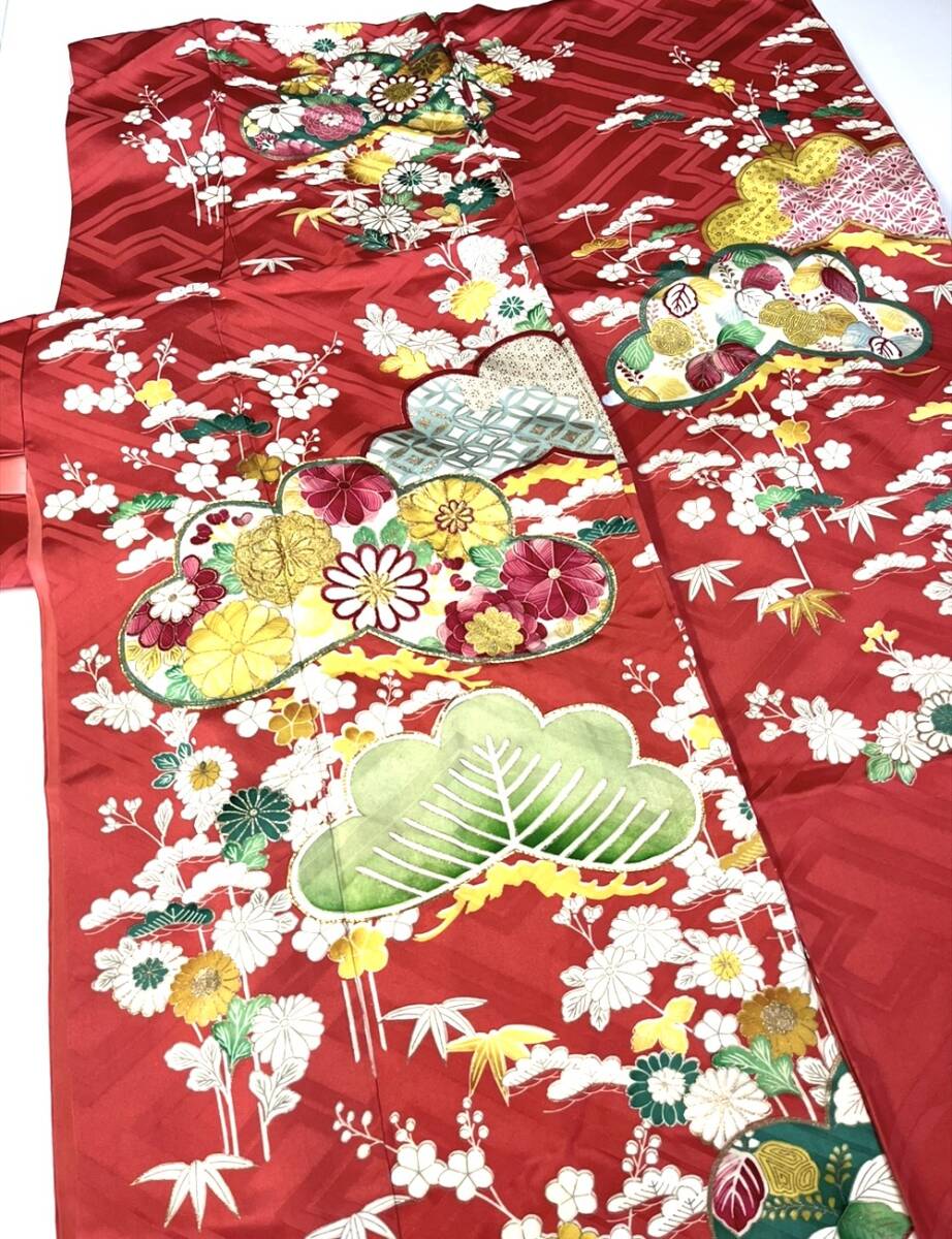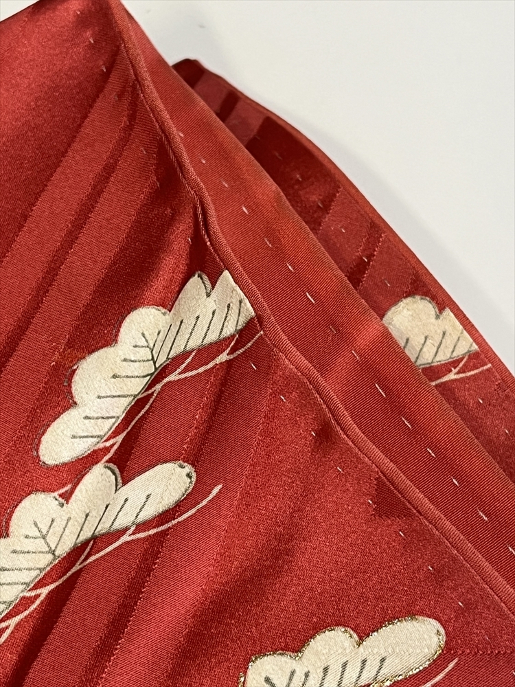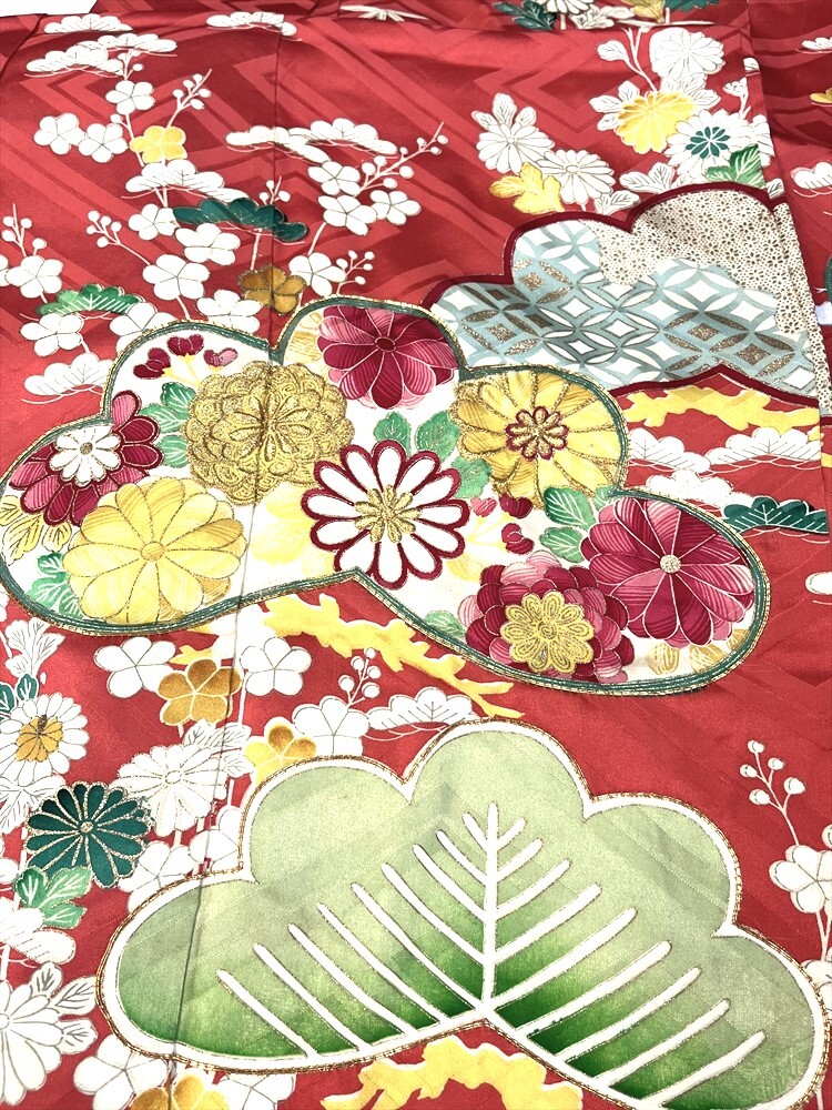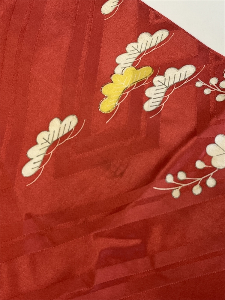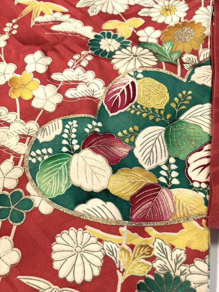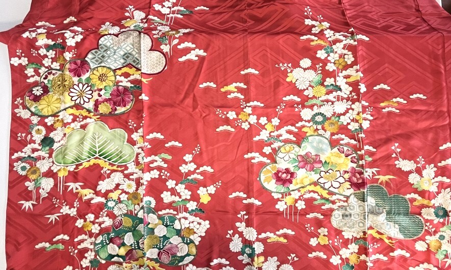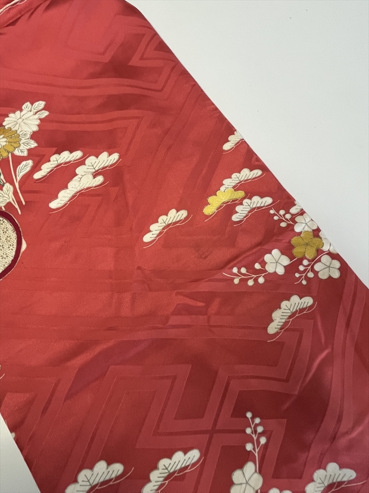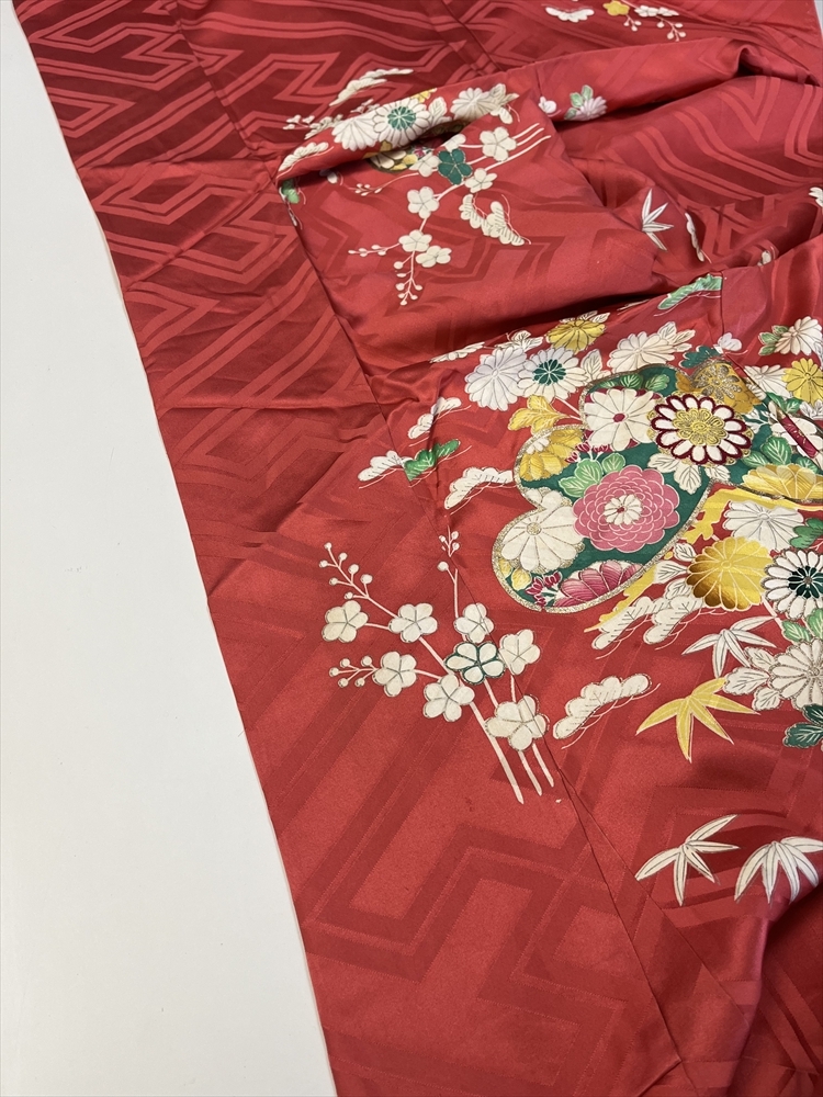 大きな紗綾型のサーモンピンクの地に草花文様が染められています。