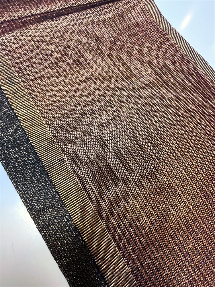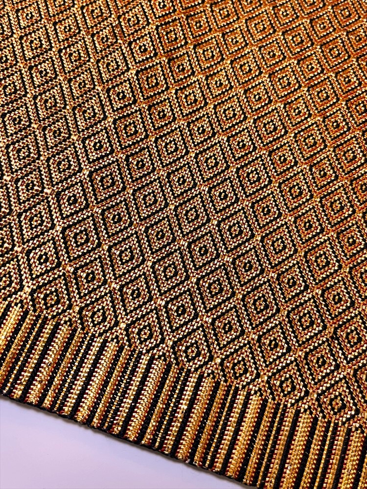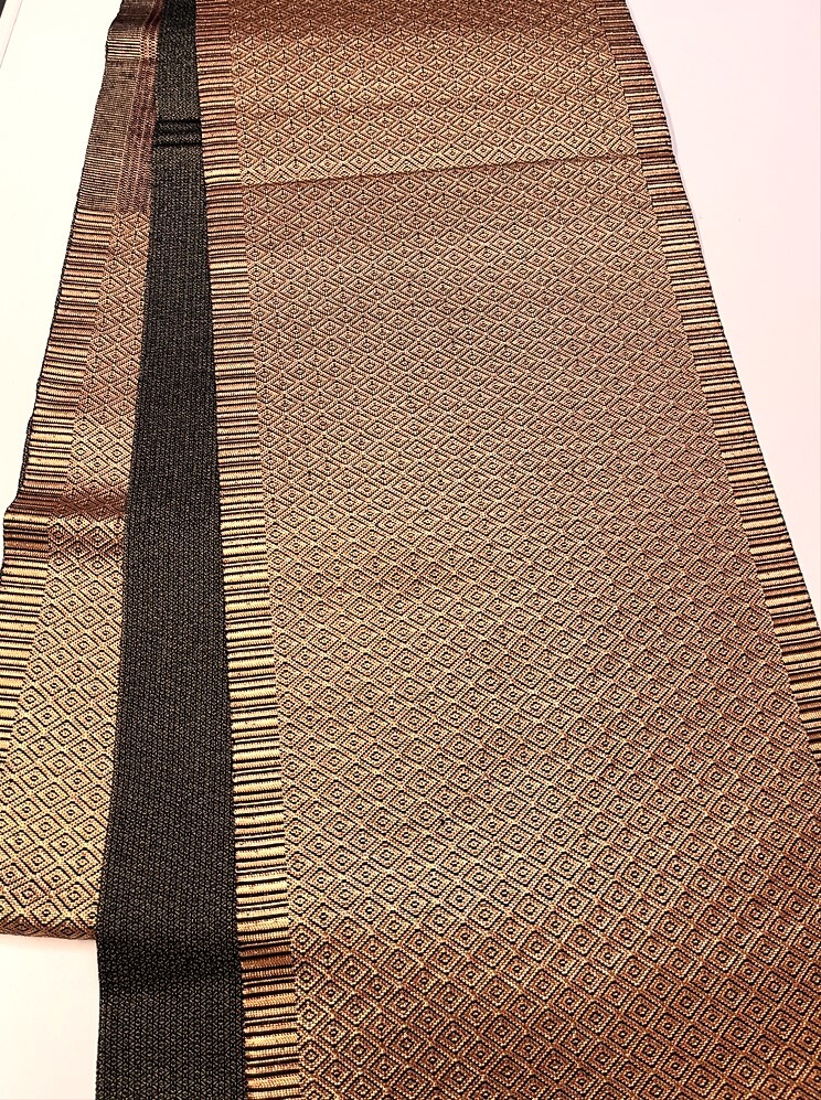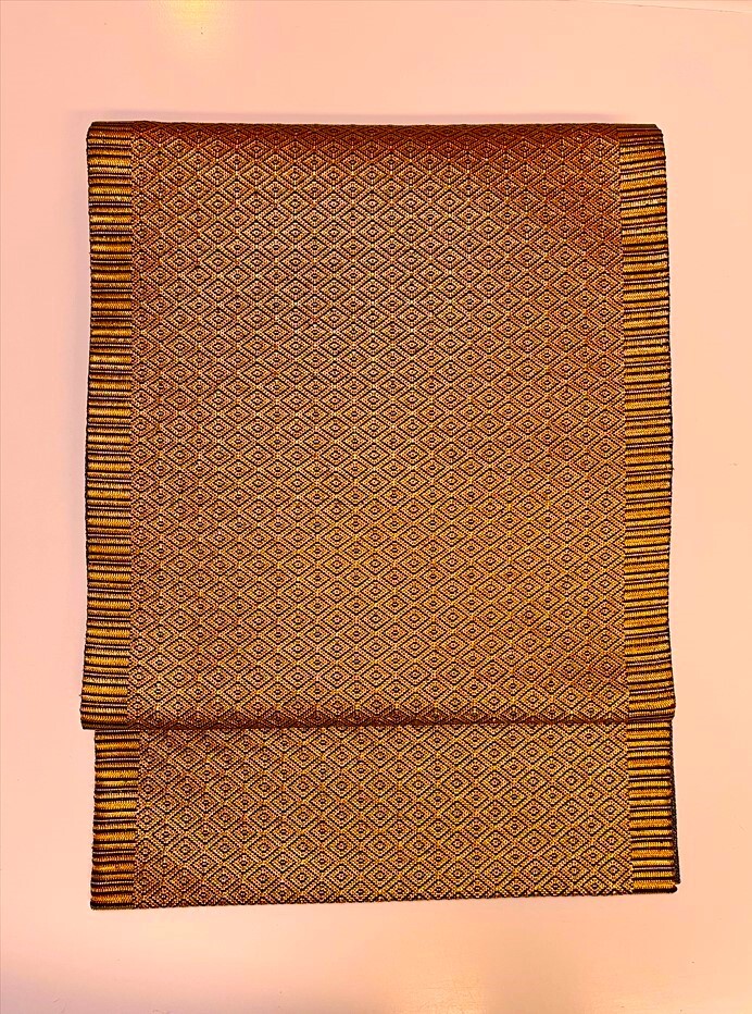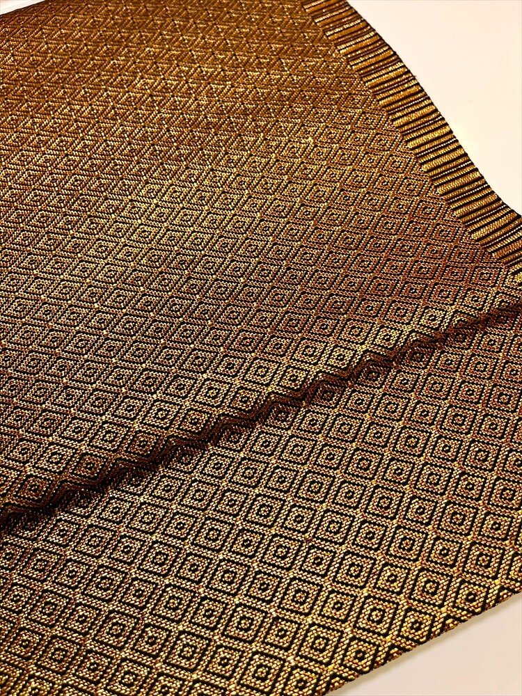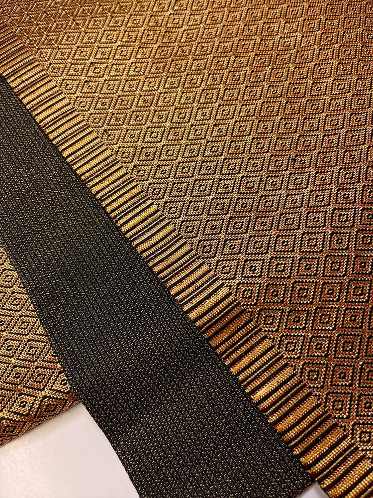 赤みの金に黒と赤の入れ子菱の錦織りです。