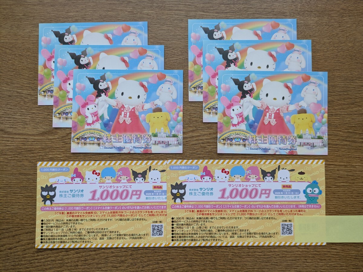 ①サンリオ株主優待券(サンリオピューロランドまたはハーモニーランド入場券)6枚