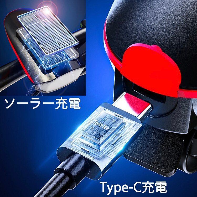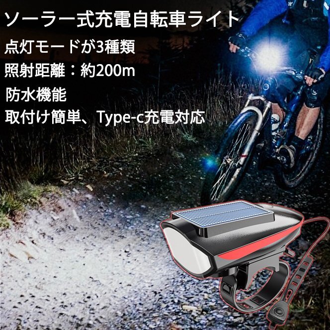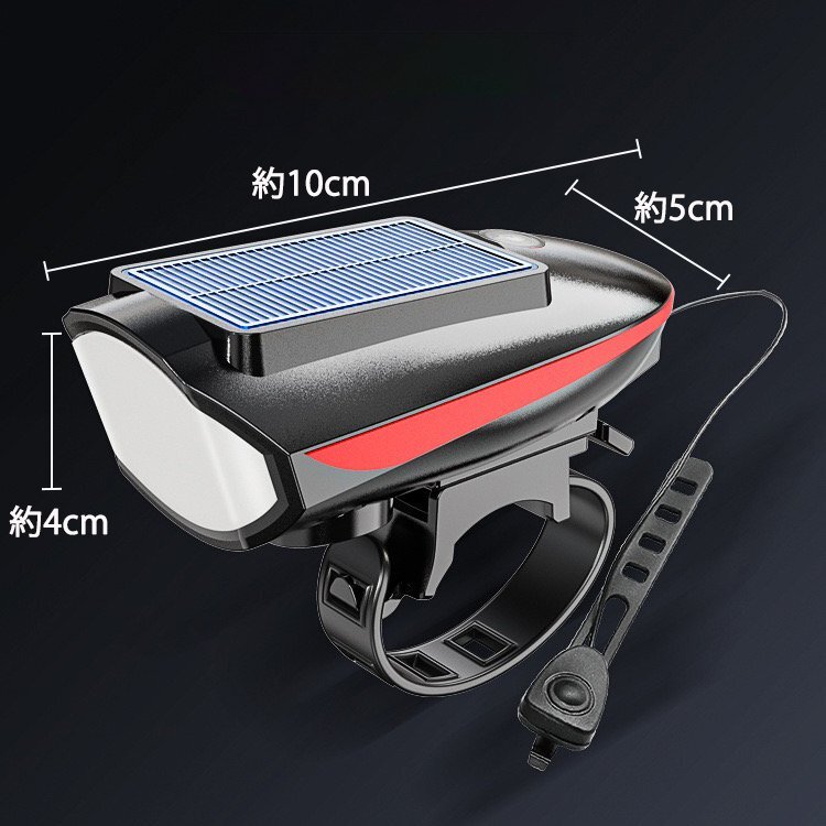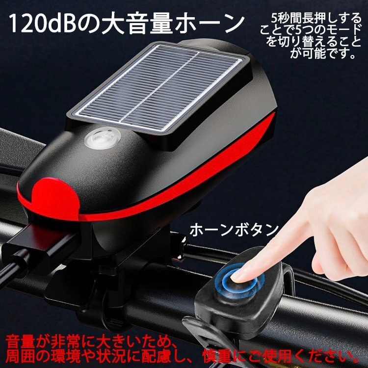 USB充電 ソーラー充電式 LED自転車ライト ホーン付き バイクライト LEDライト残量表示 自転車ヘッドライト 自転車電子ホーン