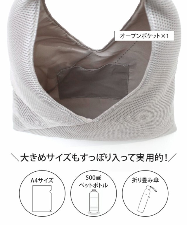 A4や500mlペットボトルが収納できるサイズ感 軽量で柔らかいメッシュ素材を使用