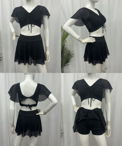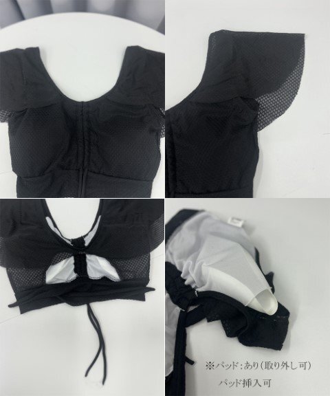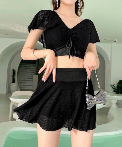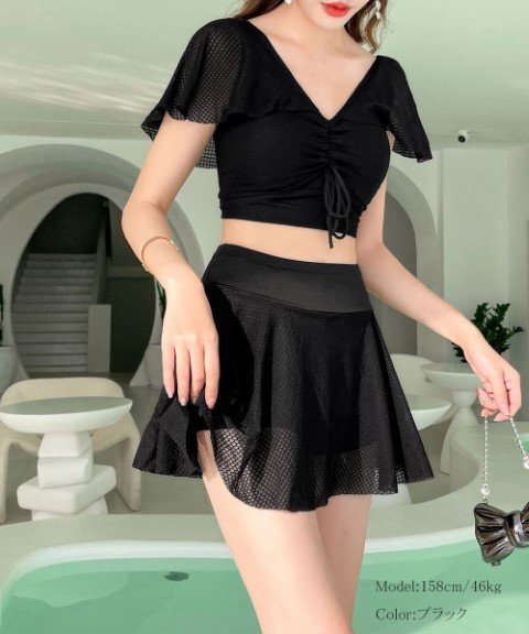 魅力的なレースアップトップスとミニスカートの水着2点セットです。