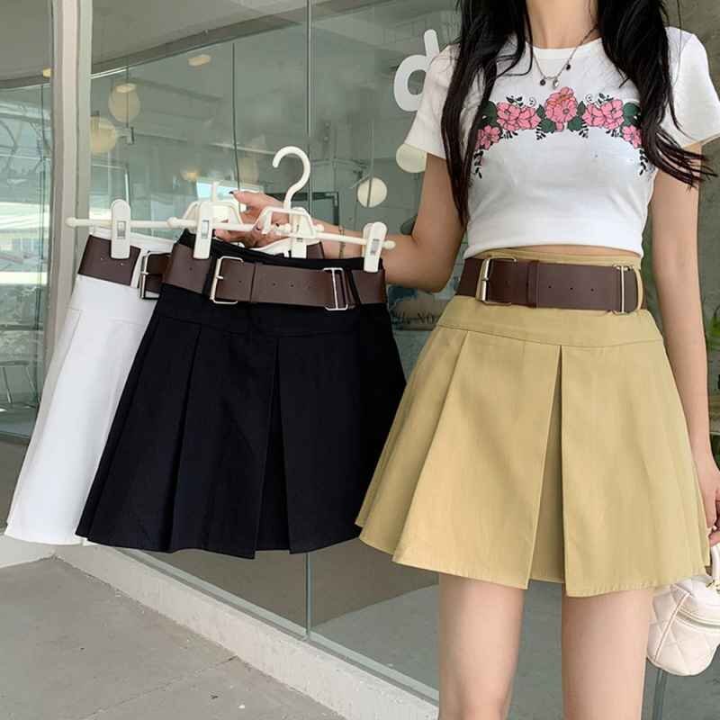 ふわっと広がるプリーツデザインが可愛らしい、ベルト付きボックスミニスカートです。