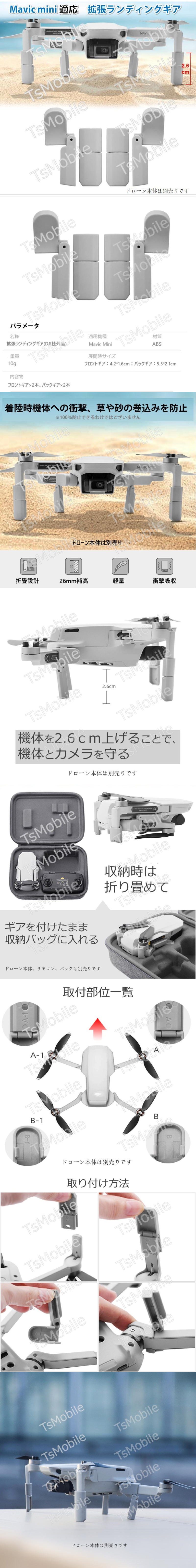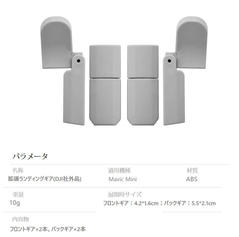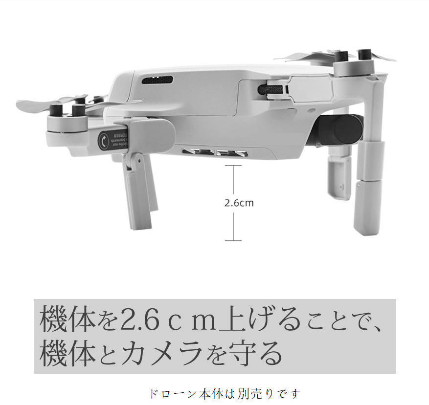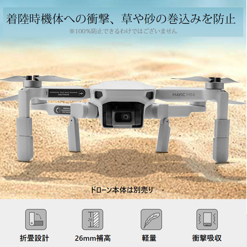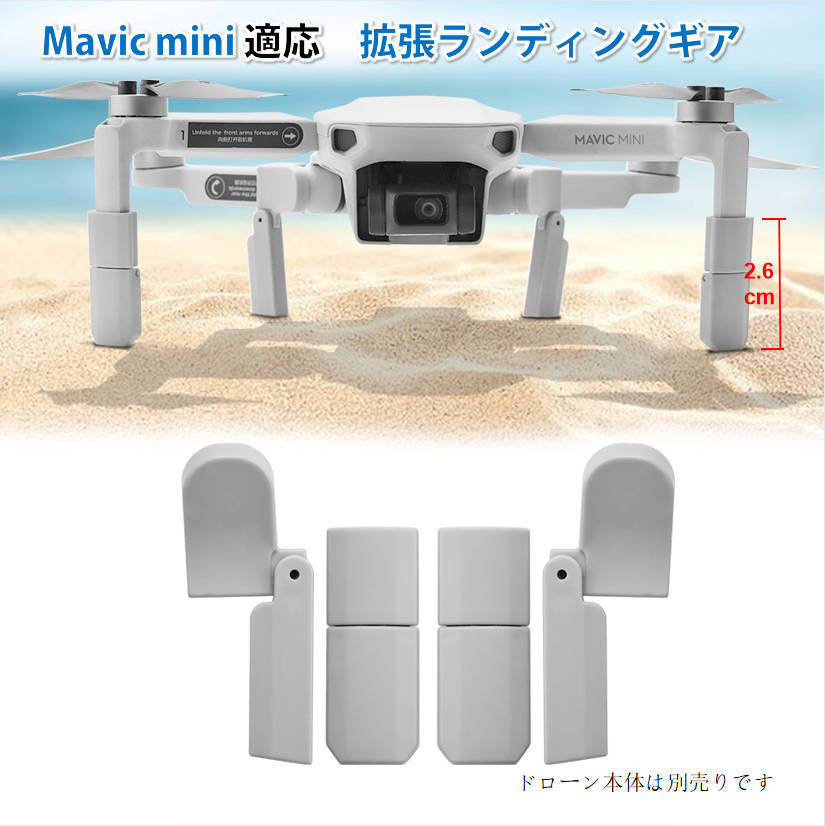 | DJI mavic mini mini2ドローン 機体の高さを上げるアクセサリーです。 MAVIC MINI用折畳式ランディングギアです。 補高により、着陸時の機体やカメラが下部障害物等への接触を防止します。また草や砂の巻込みを防げます。 正味重量:10g 素材:ABS ※DJI社外品です ※画像の中のMAVIC MINI本体・送信機・バッテリーは商品に含まれておりません |