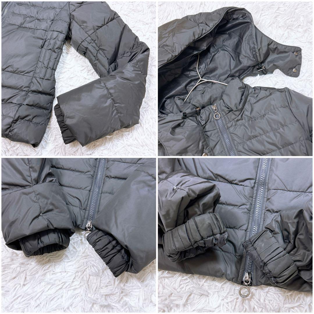 フード付きのダークグレーショートダウンジャケット、キルティングデザインで保温性に優れています。