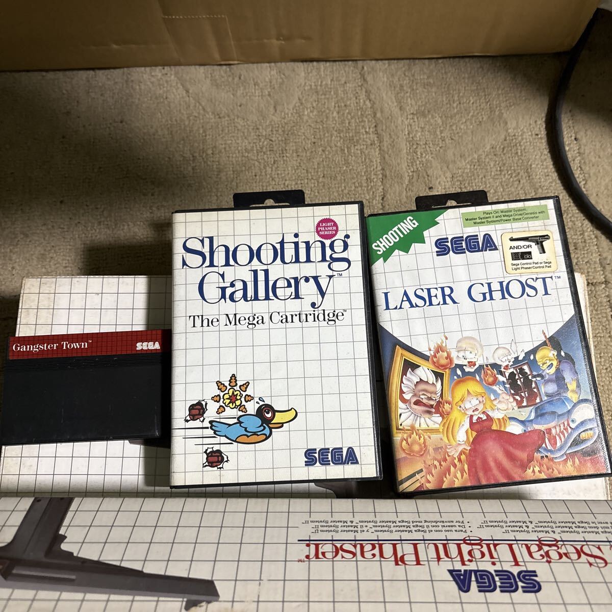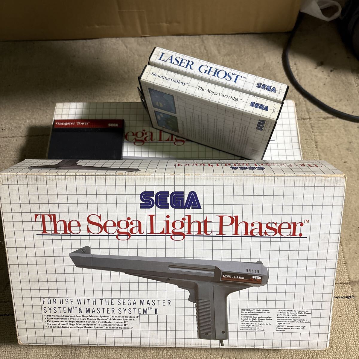 海外版のマスターシステムの光線銃2丁とソフト3つも追加します。光線銃は液晶テレビでは使えませんのでブラウン管テレビで遊んでください。