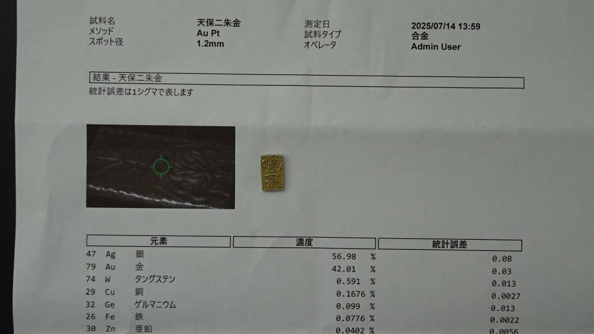 天保二朱金(カタログは天保二朱判金)です。最近の金の高騰で偽物が心配な方向けに成分分析表を取得しました。状態は美品です、画像判断もお願いします。また記事に間違いがあった場合は、画像優先でお願いします。不明な場合はご質問下さい。