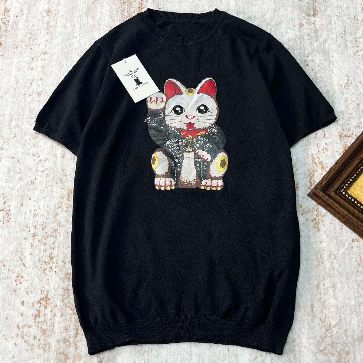 一枚限定 半袖 tシャツ ロンドン製造 ウール混 快適 通気 ソフト ニット 個性 可愛い 招き猫 カットソー トップス カジュアル 街着 SIZE:M