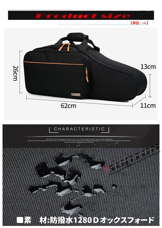 ALTO SAX CASE アルトサックス用ケース■管楽器 楽器ケース バッグ■アルト サクソフォーン用■カラー: ブラック■素 材:防撥水1280Dオックスフォード中 部 約18mmフォームパッドを採用(サックスを保護)■外寸法: 62×26×11m■バックポケット(A4サイズ対応)■外寸法: 38×24×4cm■重量: 約0.80Kg■リュックタイプストラップ付属(ショルダー兼用)■内側には柔らかいボアが付きでサックスを衝撃保護※画像はイメージです。サックス本体は付属しておりません。一般的なアルトサックスを参考にしている汎用のケースです。