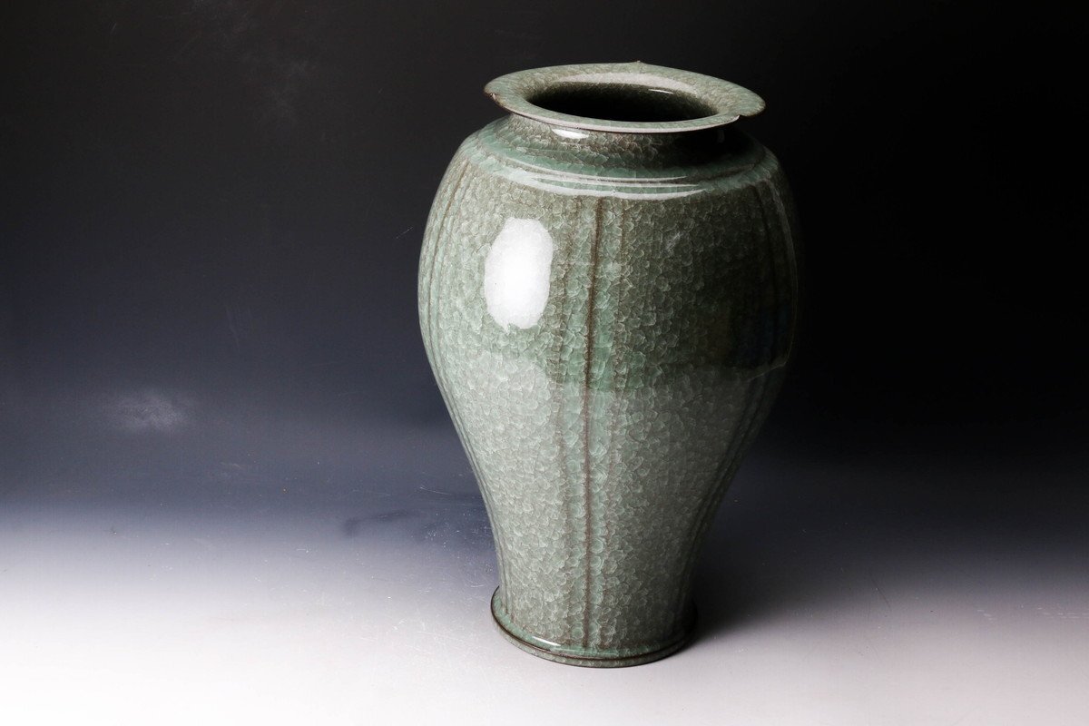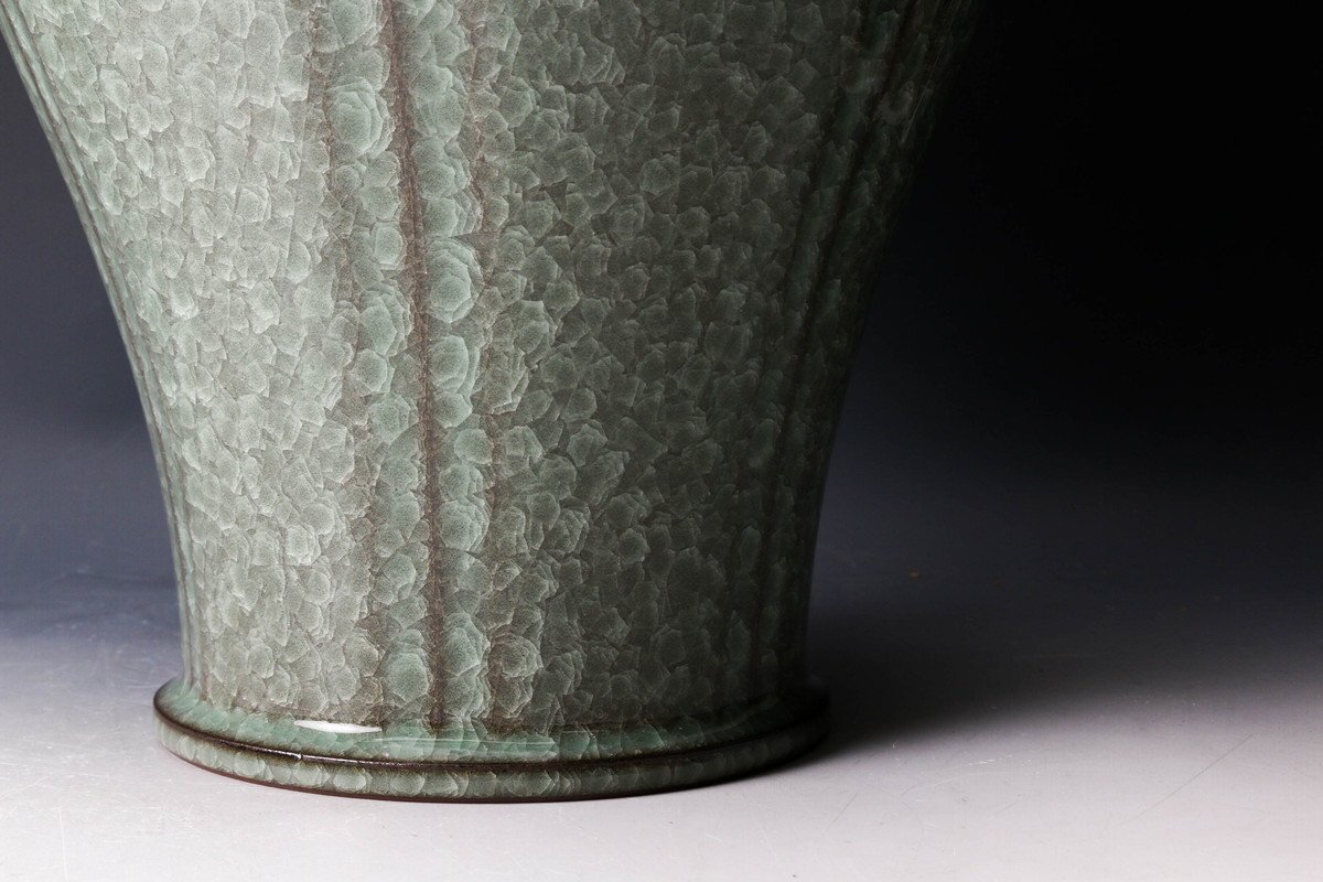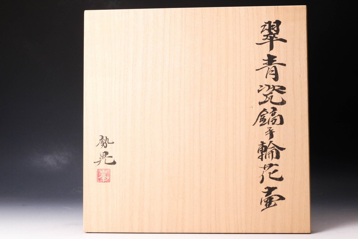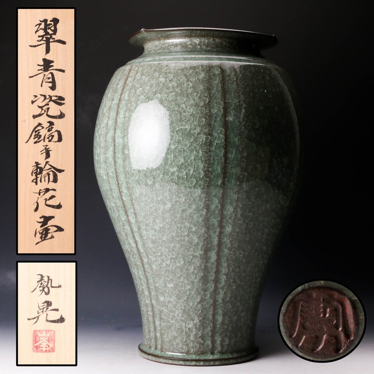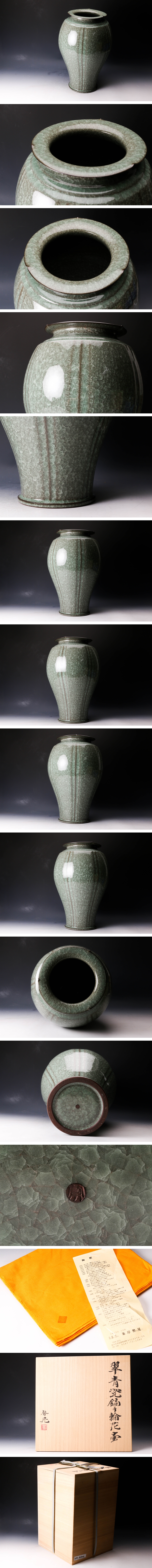 【佳香】峯岸勢晃 高さ42cm 翠青瓷鎬手輪花壷 共箱 共布 栞 本物保証