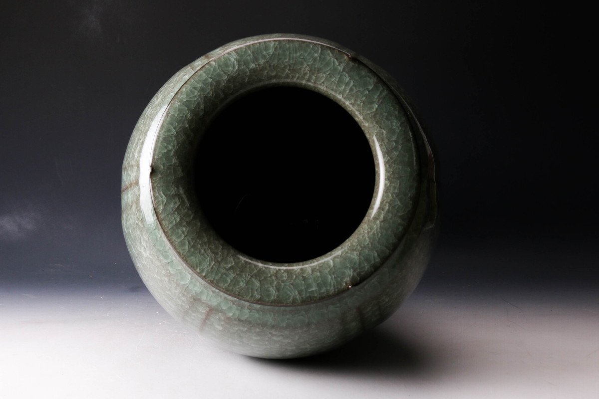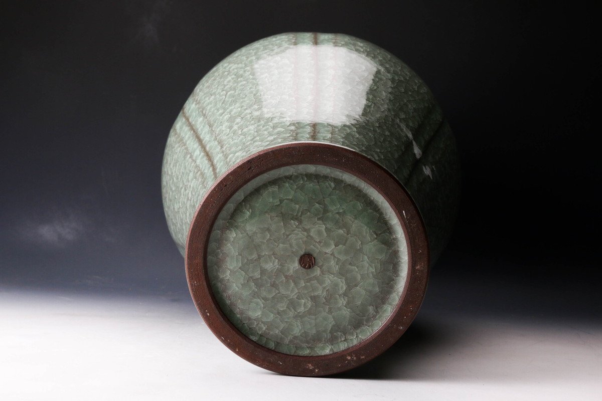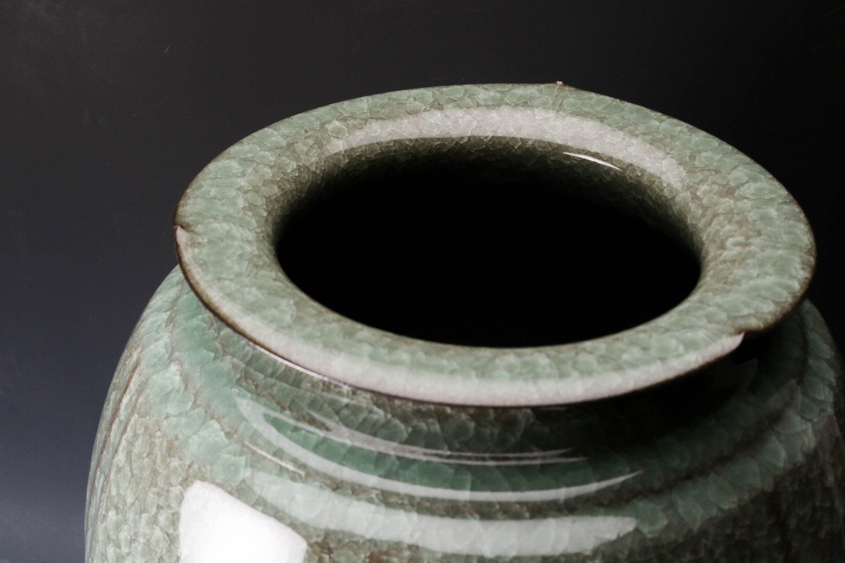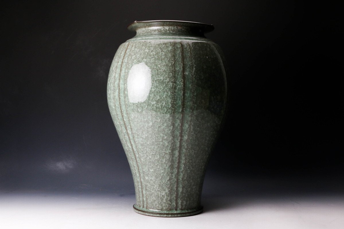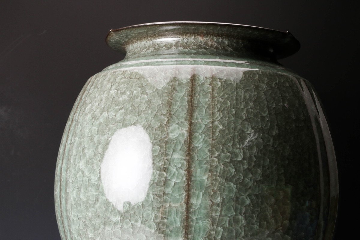 【佳香】峯岸勢晃 高さ42cm 翠青瓷鎬手輪花壷 共箱 共布 栞 本物保証