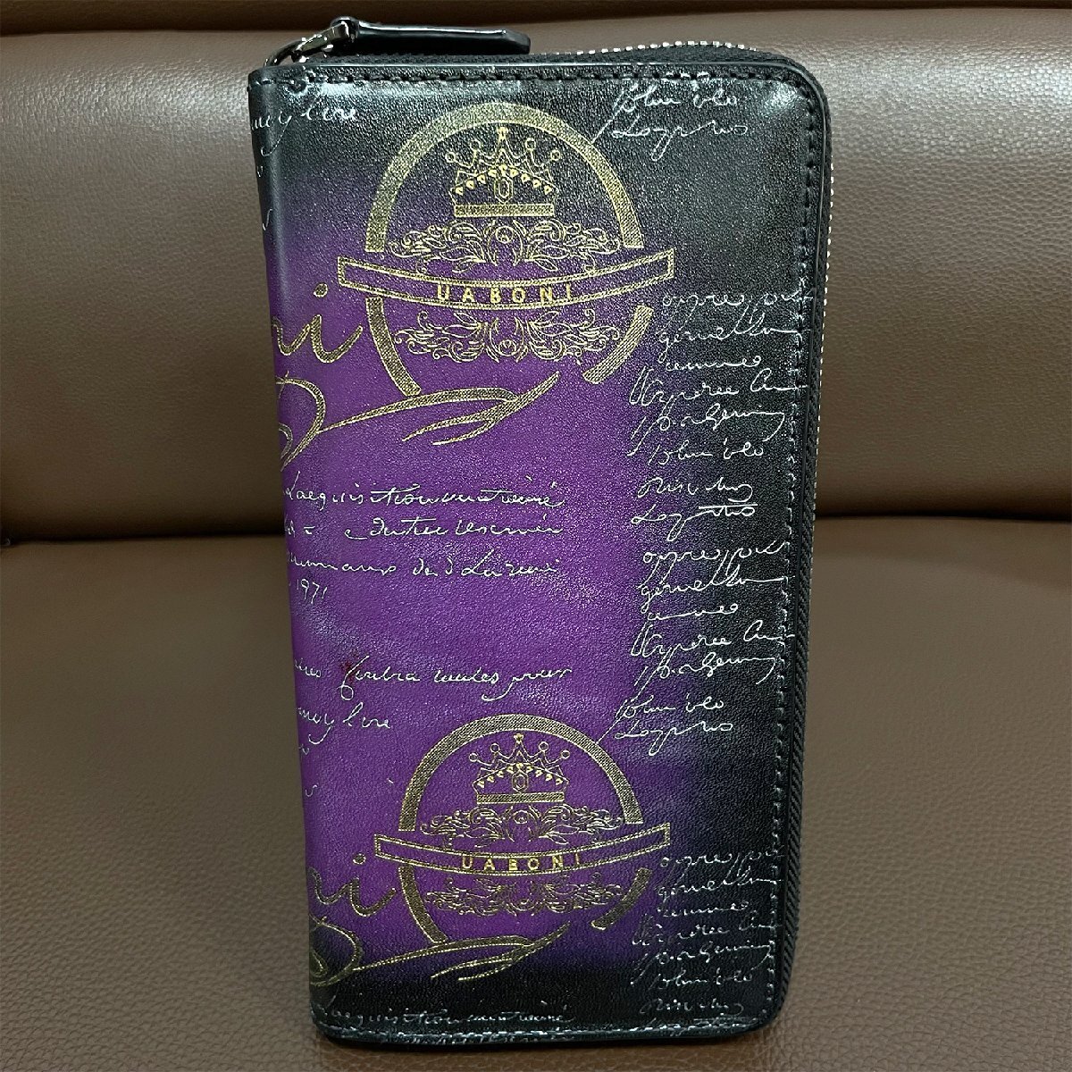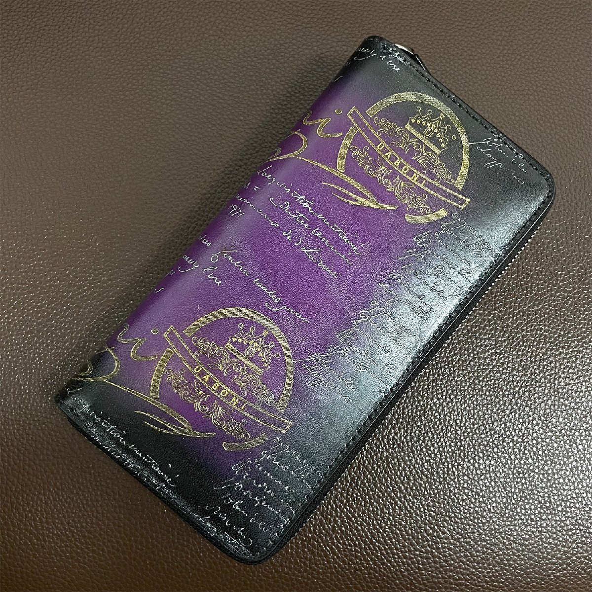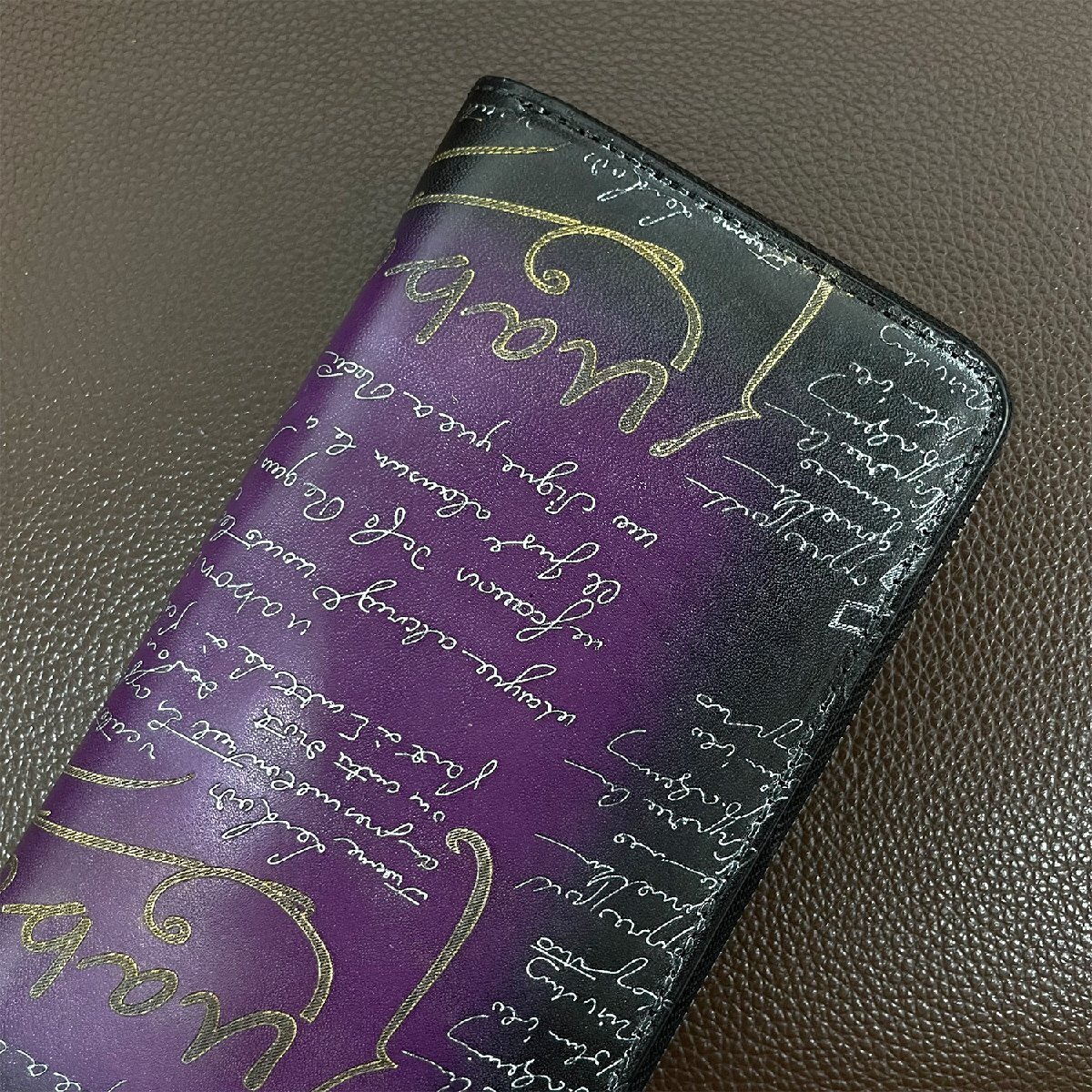 染料の開発成功は製作の一番重要な問題の解決に繋がり、職人が一つ一つの工程にこだわり作り上げた牛革長財布です。一番こだわりの工程はカリグラフィーの彫り込みと革の着色です。